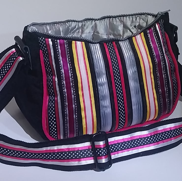 The Handbag fastens with a black and silver chunky zip, which when open reveals a quilted silver and pink quilted lining which has a matching (to the back) zipped inside pocket with makers label.