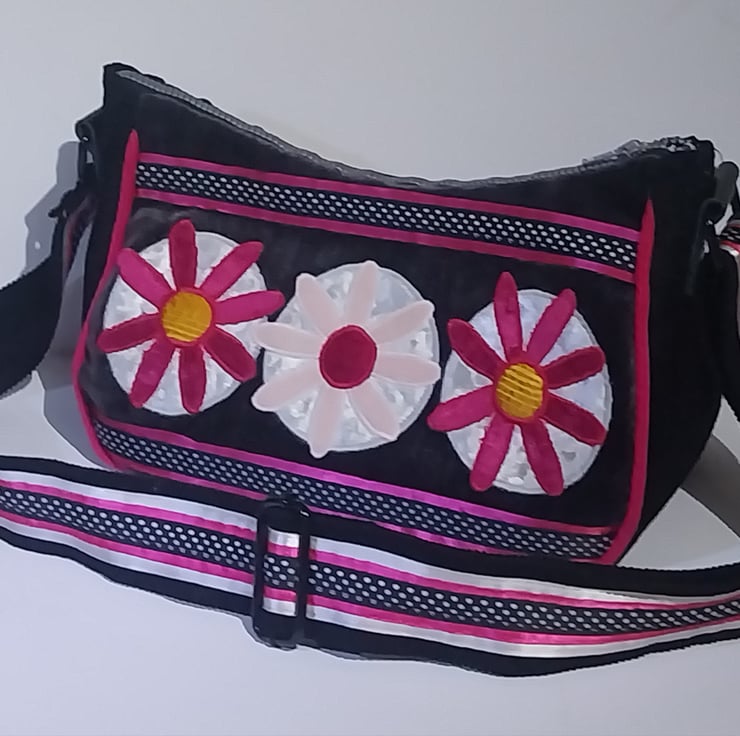 This handbag is designed to a celebration of daisies and textures of fabrics and colours.