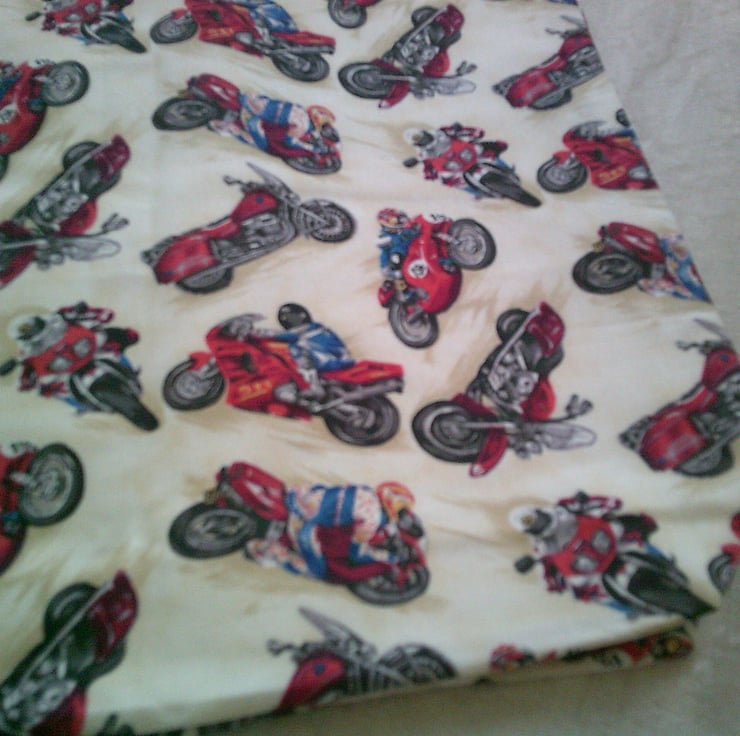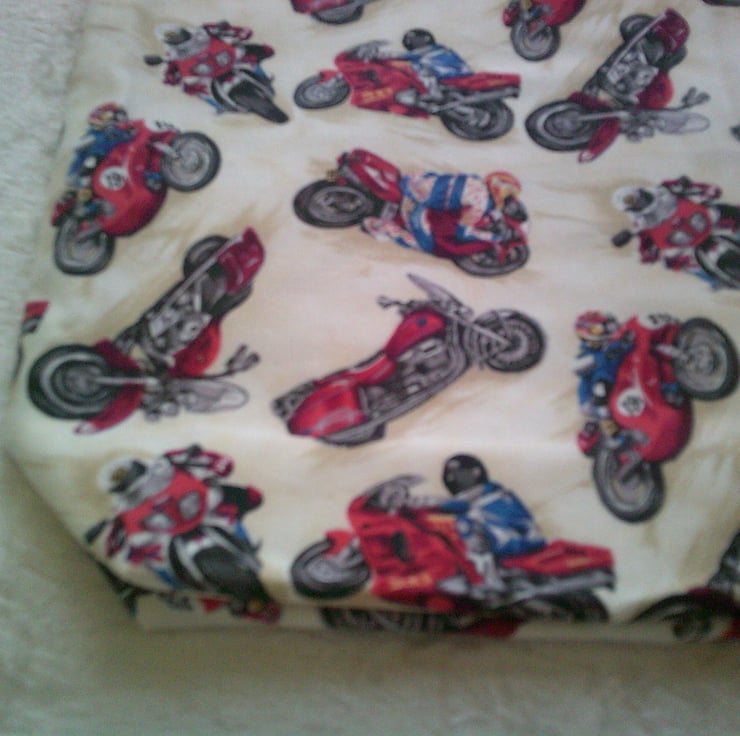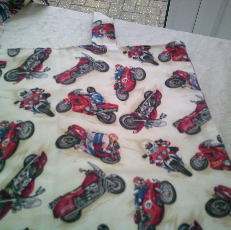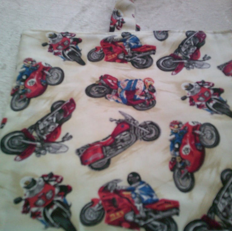 This Eco Friendly, fabric bag is made using 100% Cotton and the design on the fabric is Motorbikes on a cream background and is fully lined.