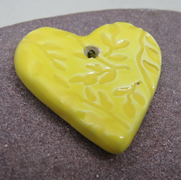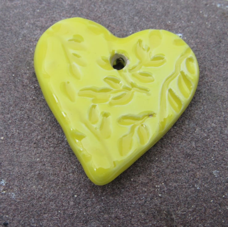 Medium Lemon Yellow Leaf Texture Heart Shaped Ceramic Pendant