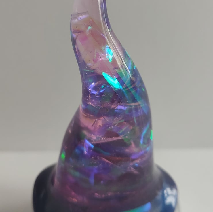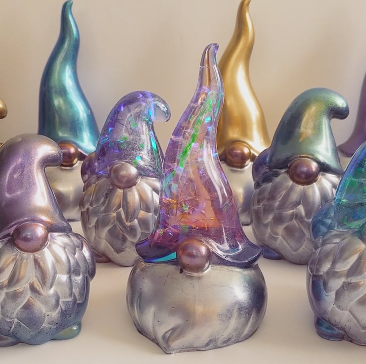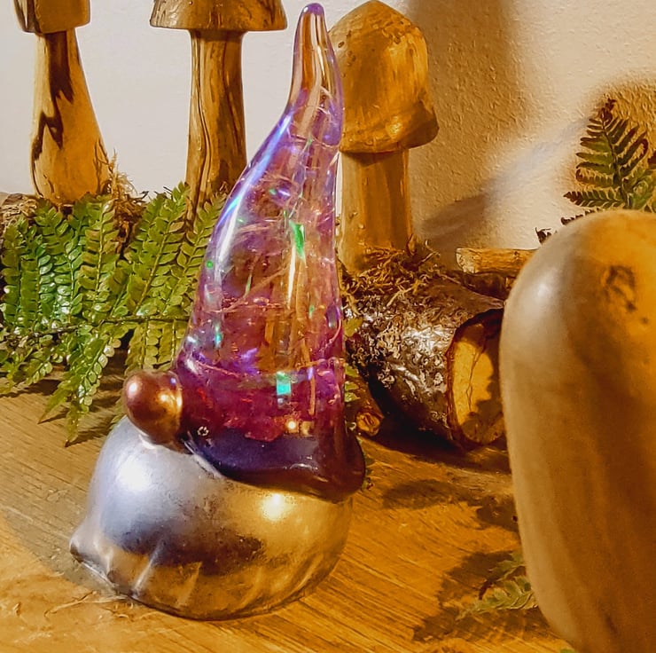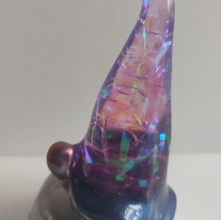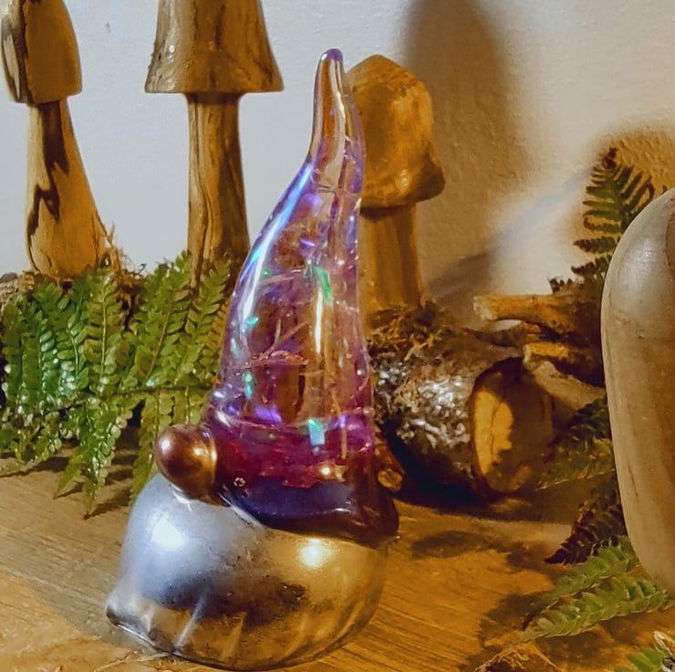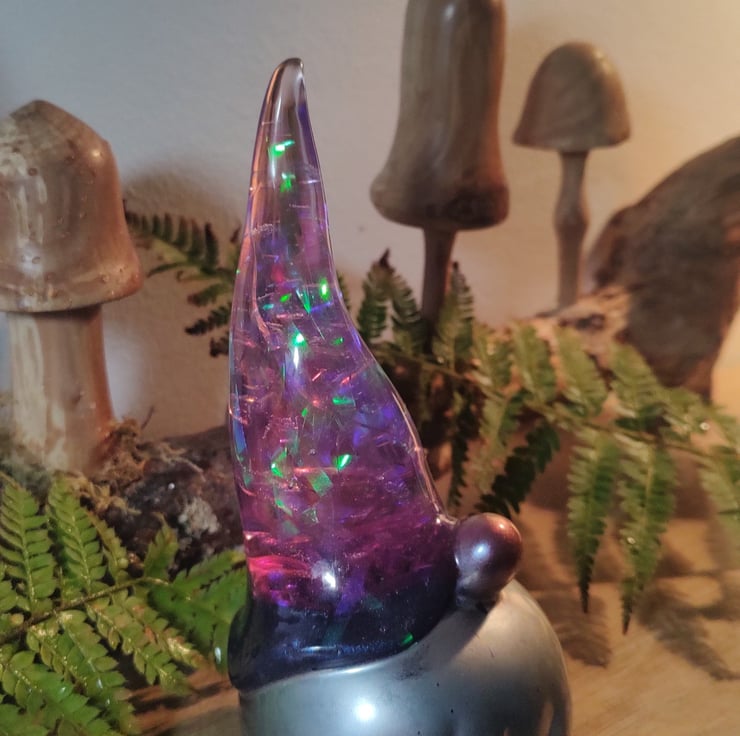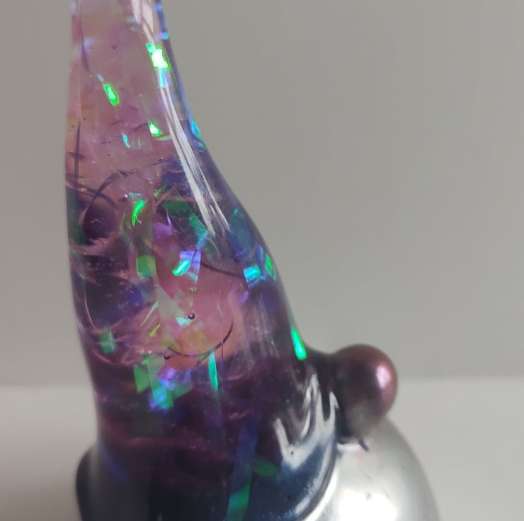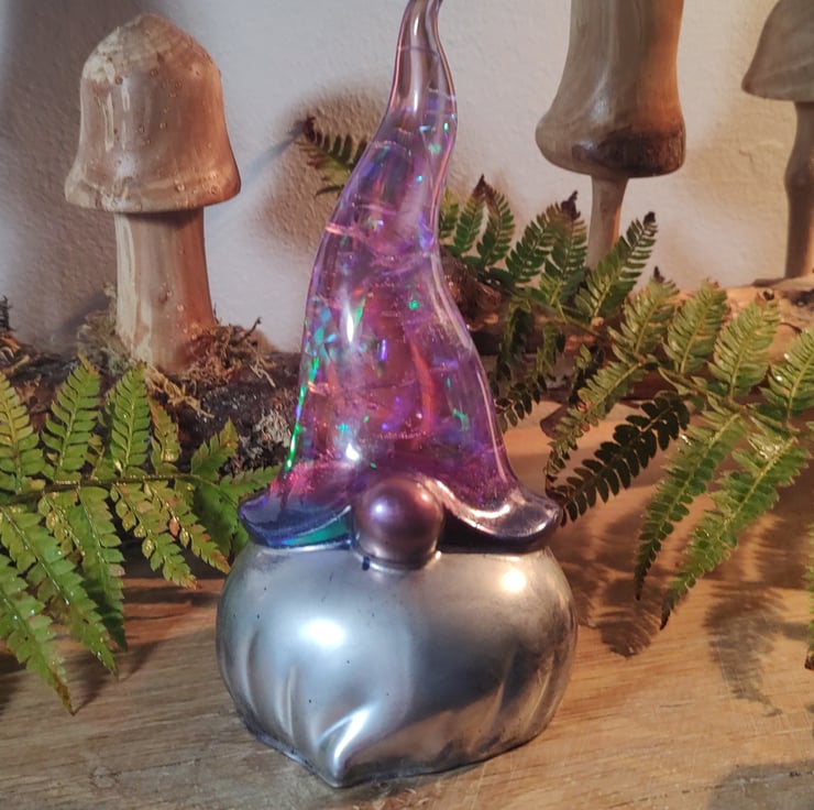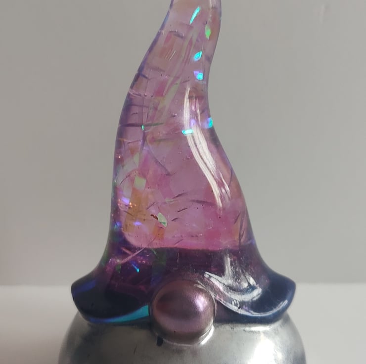 This is a beautiful handmade resin gonk. He has a silver beard and a pink and iridescent hat, a silver beard, and a metallic pink nose. While some of my handmade gonks may be similar in appearance, they are all individual and unique.