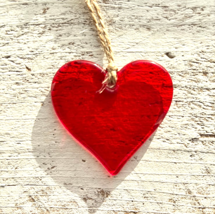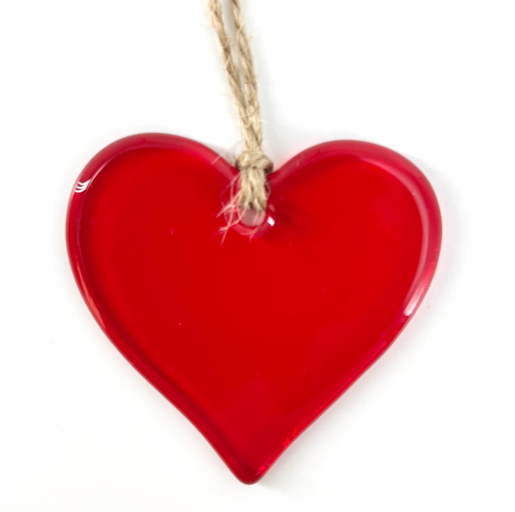 This heart is made from a vibrant piece of red glass. The glass is cut and ground by hand and fired in my kiln to soften the edges and give it an amazing shine. It is approx 5cm and hangs on a length of jute.