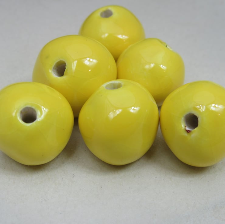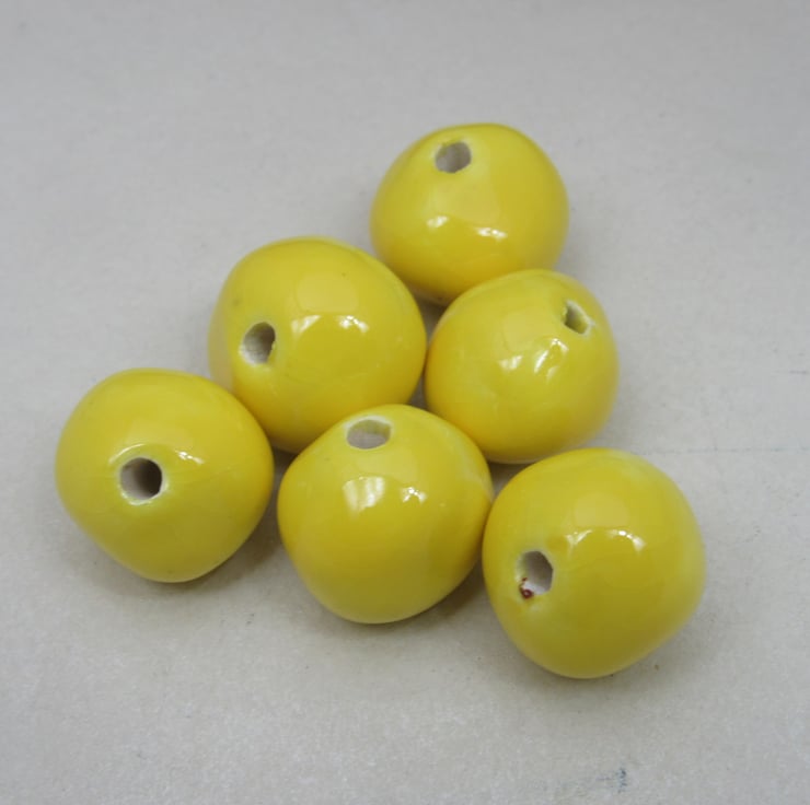 A mixture of handrolled ceramic beads, finished with a bright lemon yellow glaze.