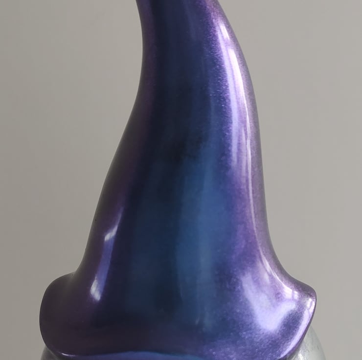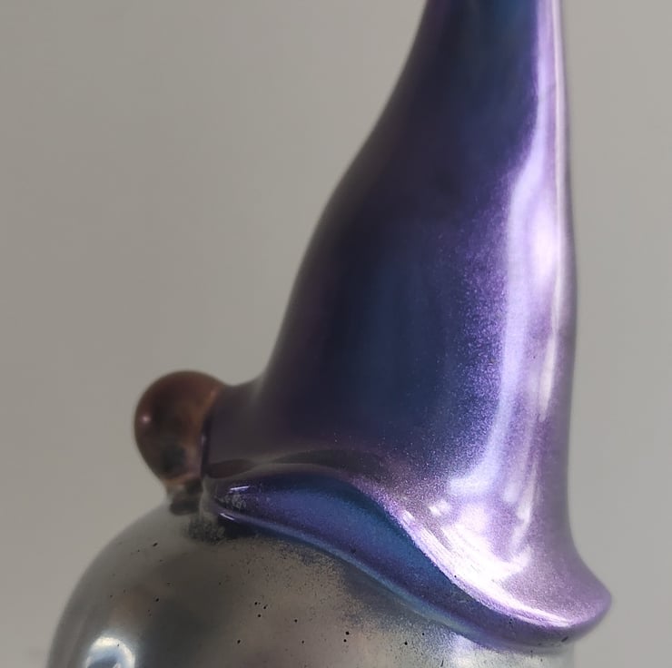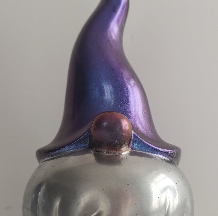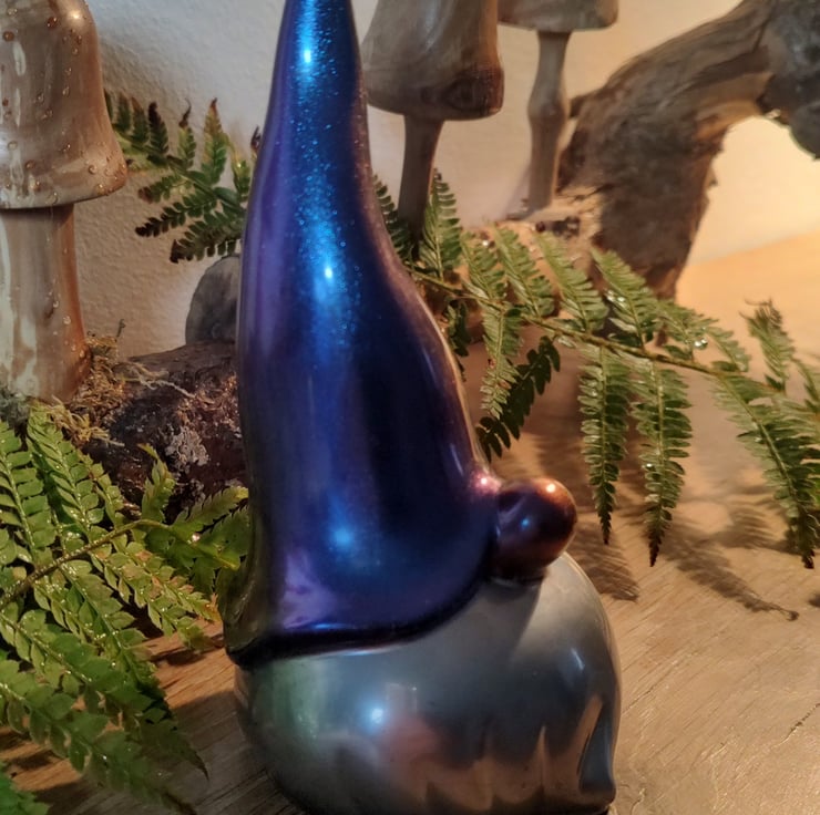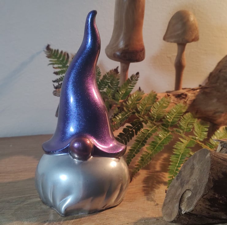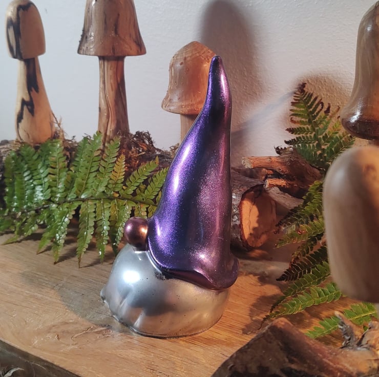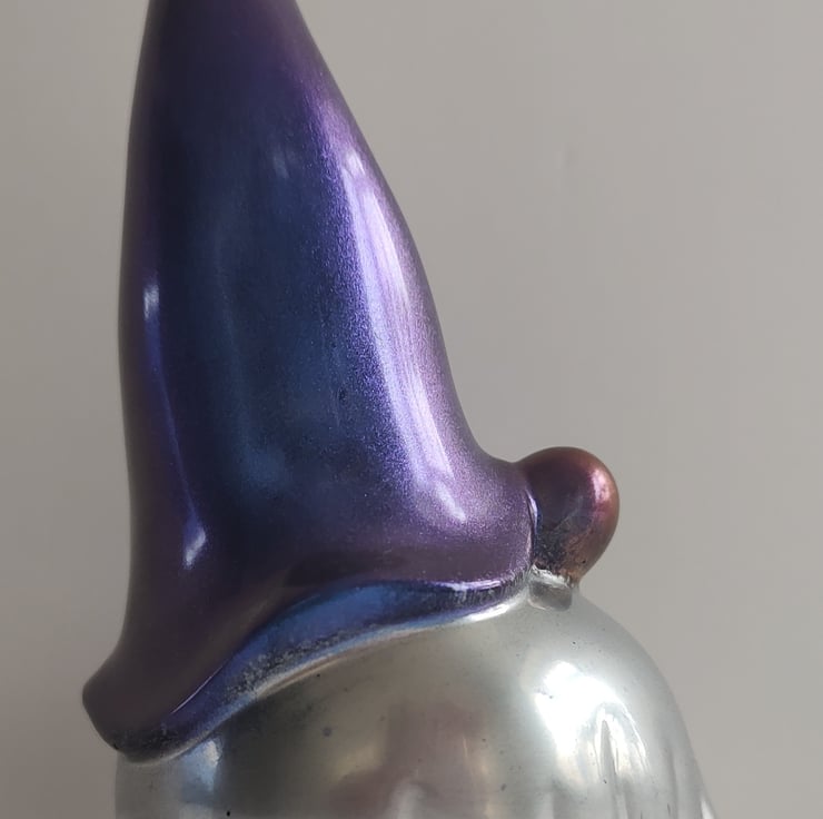 This is a beautiful handmade resin gonk. He has a metallic purple hat, a silver beard and a matallic pink nose. While some of my handmade gonks may be similar in appearance, they are all individual and unique.