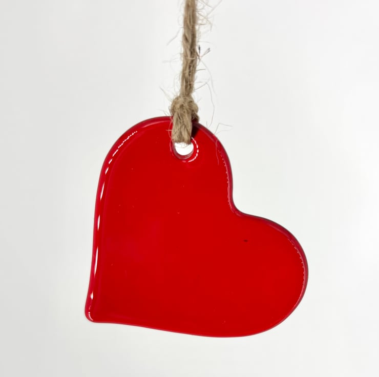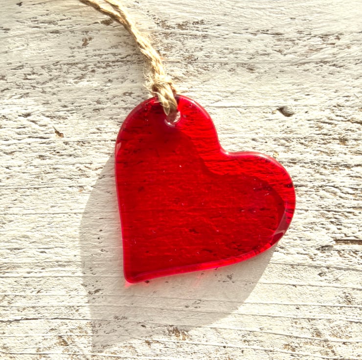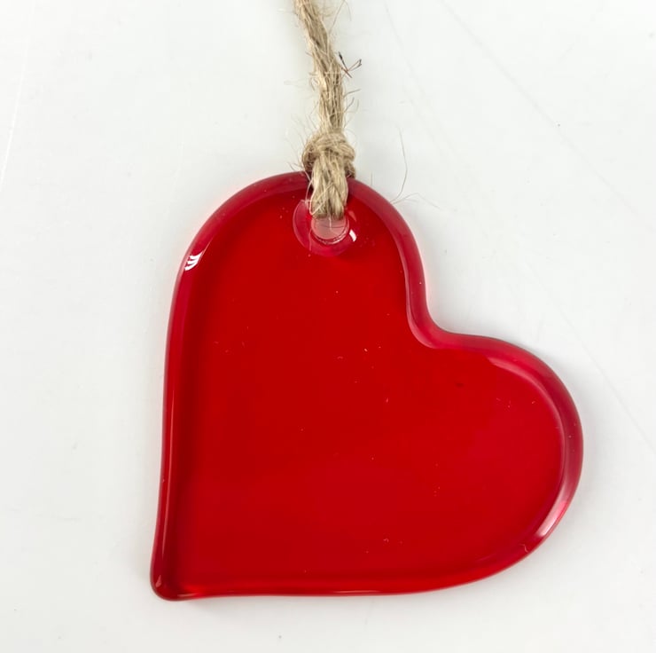 This heart is made from a vibrant piece of red glass. The glass is cut and ground by hand and fired in my kiln to soften the edges and give it an amazing shine. It is approx 5cm and hangs on a length of jute.
