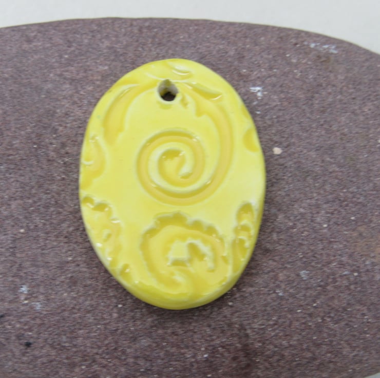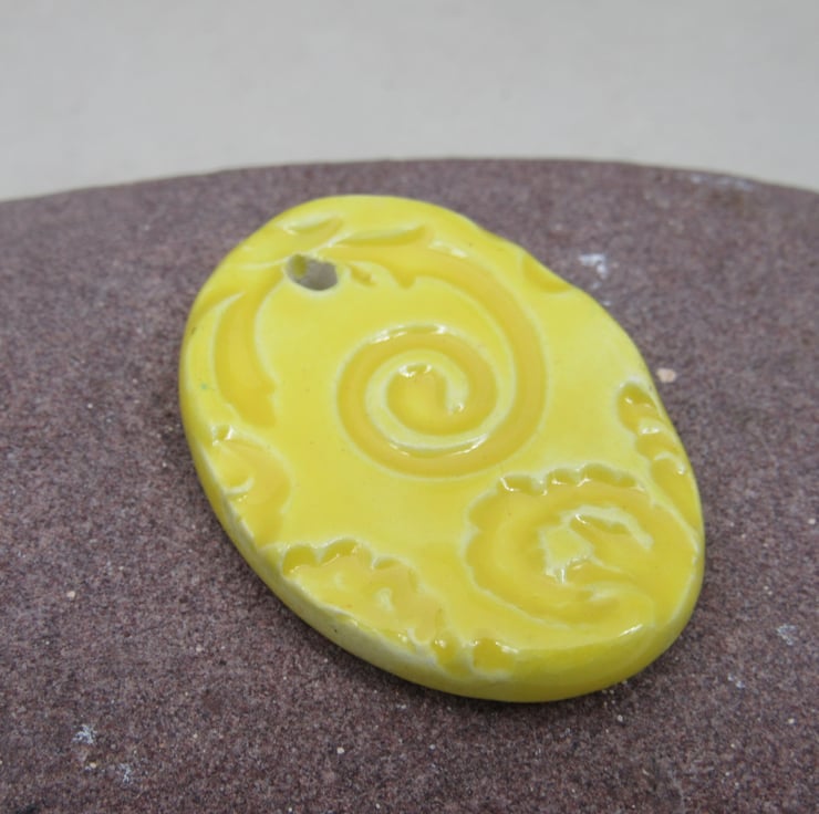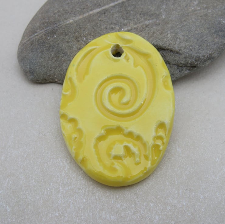 Large stoneware ceramic pendant, patterned with an embossed design of leaves and flowers, and finished with a bright lemon yellow glaze.