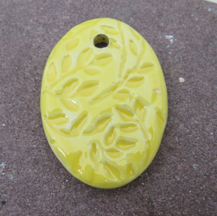 Large stoneware ceramic pendant, patterned with an embossed design of leaves and flowers, and finished with a bright lemon yellow glaze.