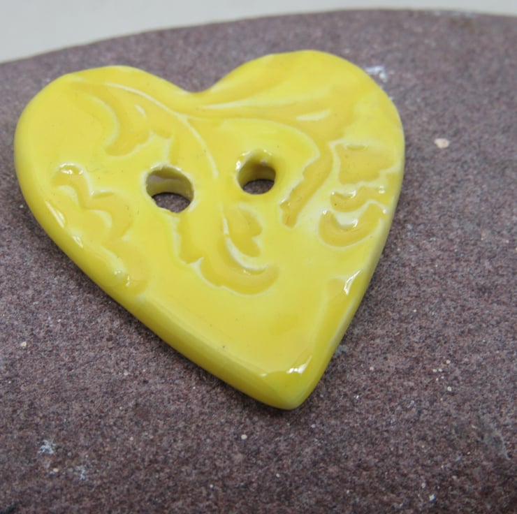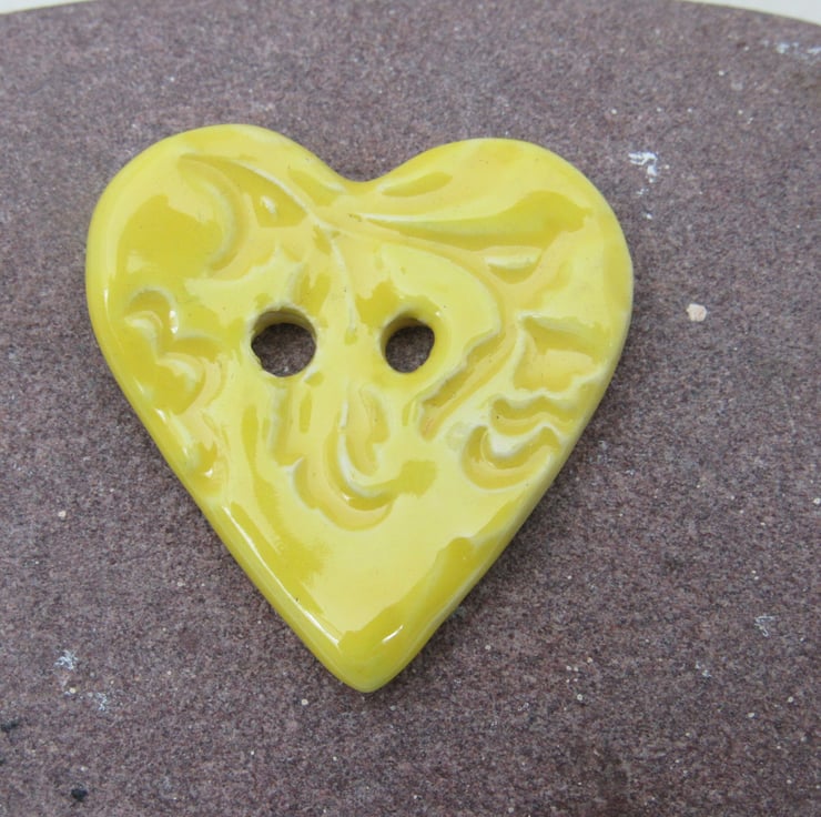 Medium heart shaped stoneware button, textured with a bold leaf and flower motif.