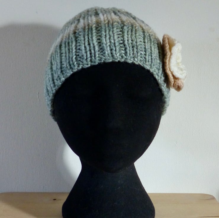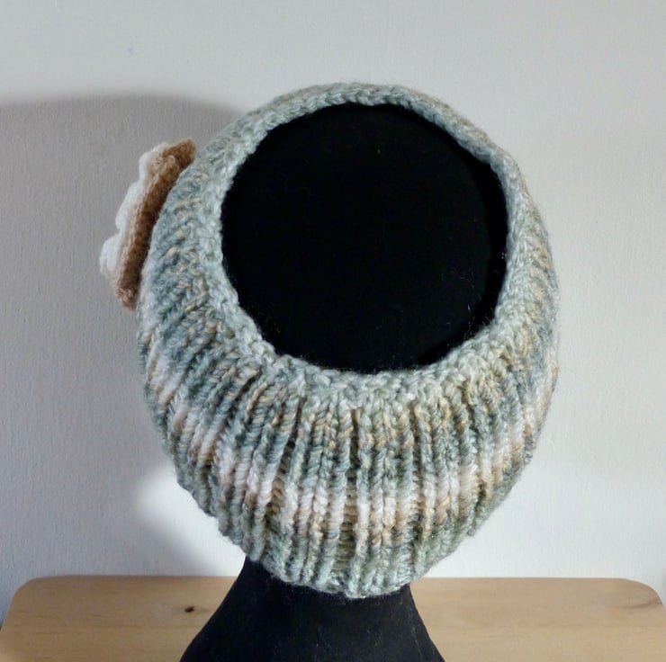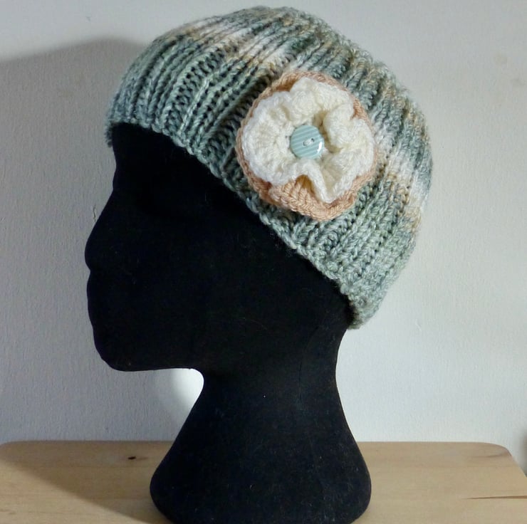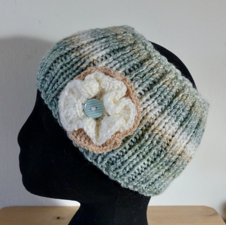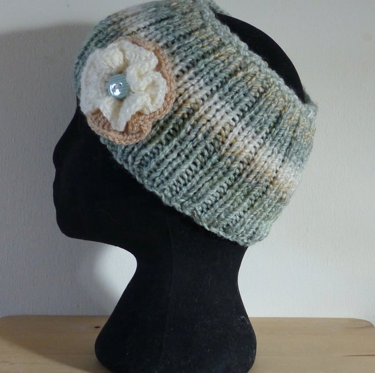 A hand knitted Headband in a chunky variegated yarn in shades of Light Green, Caramel and Cream. It has a double layer crocheted flower attached in Caramel and Cream yarns with a Pale Green Striped button in the centre.