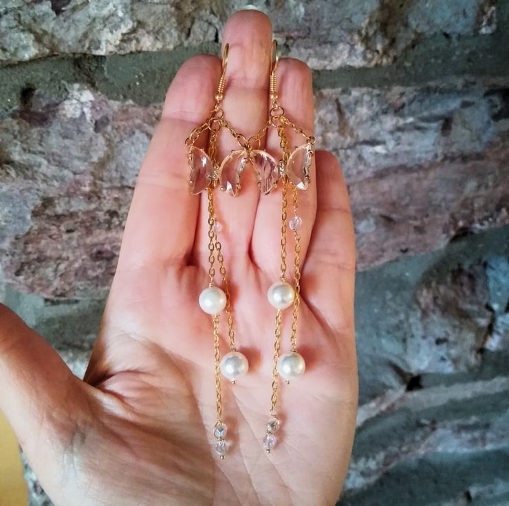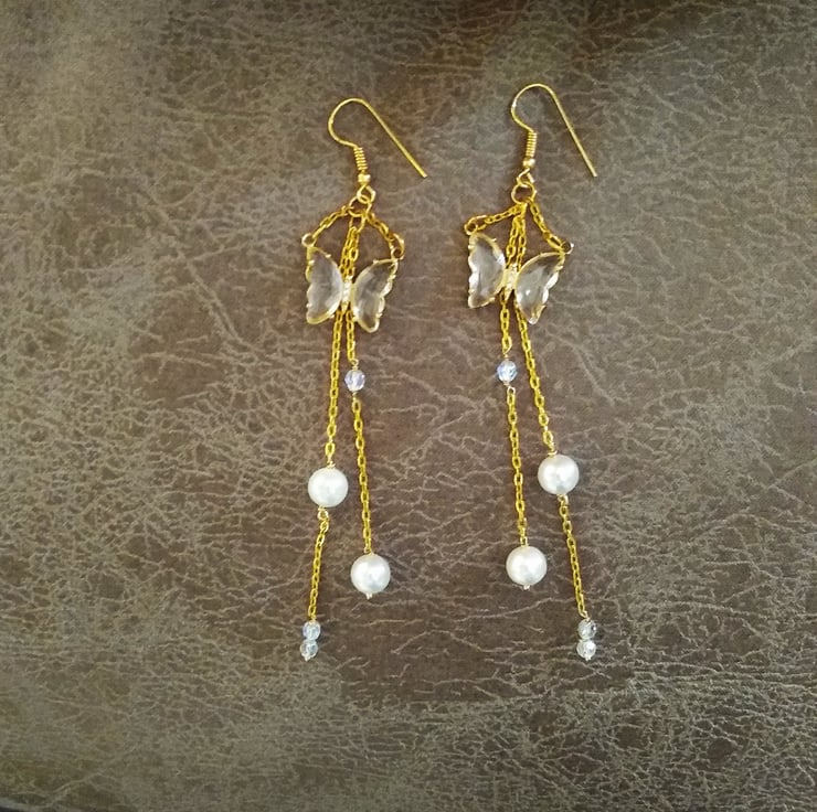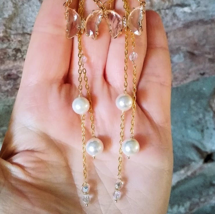 Elevate your look with these sleek, elegant extra long shoulder length earrings. Handmade for the modern woman, using gold plated chain and a scattering of shell pearls and crystal beads. Topped off with a crystal clear faceted winged butterfly charm to complete your look of sophistication. Lightweight and comfortable to wear all day or night. A true timeless pair of earrings for any occasion and perfect with any colour outfit. Whether you are gifting them or treating yourself, they are sure to bring delight.