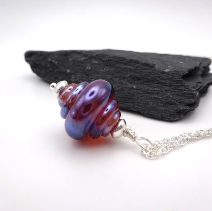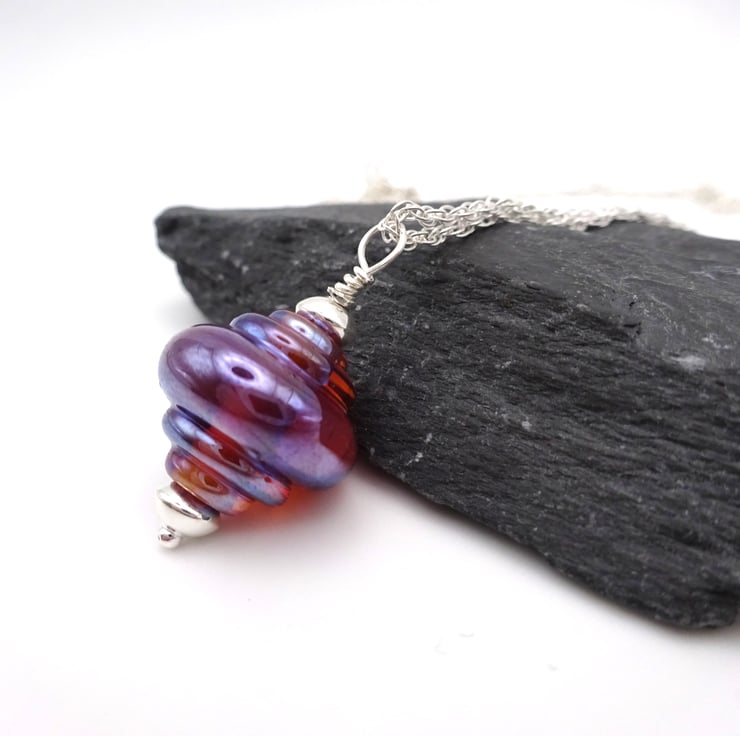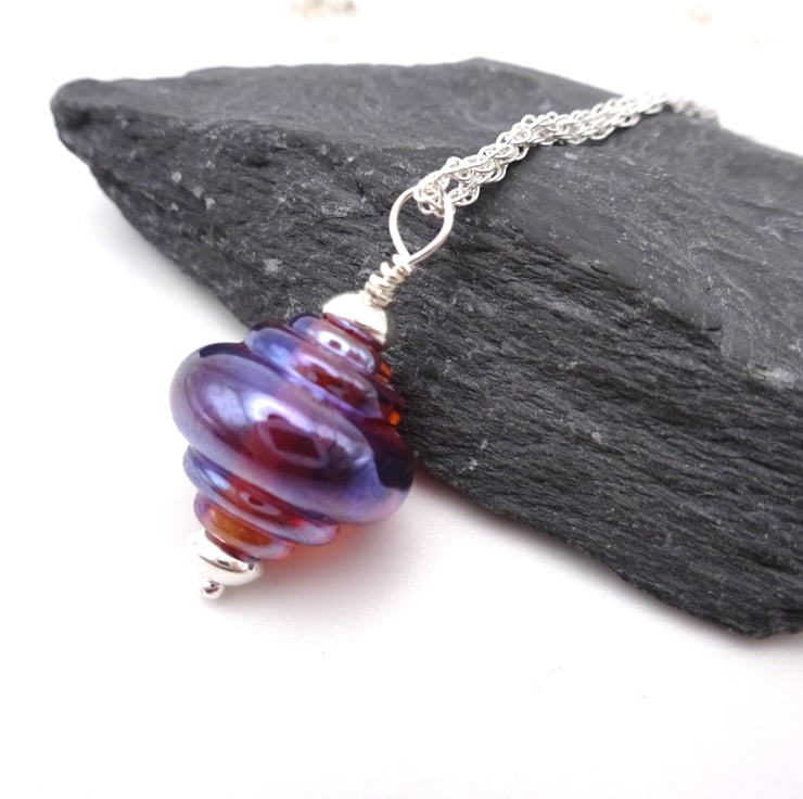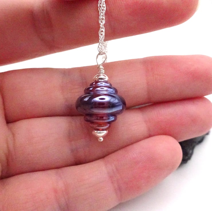 A handmade lampwork glass purple metallic pendant strung onto a sterling silver chain.