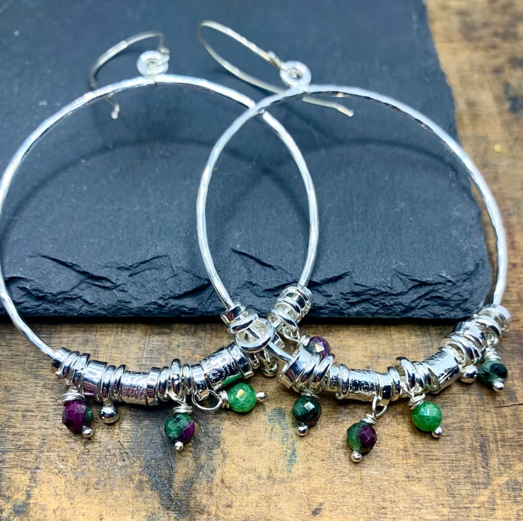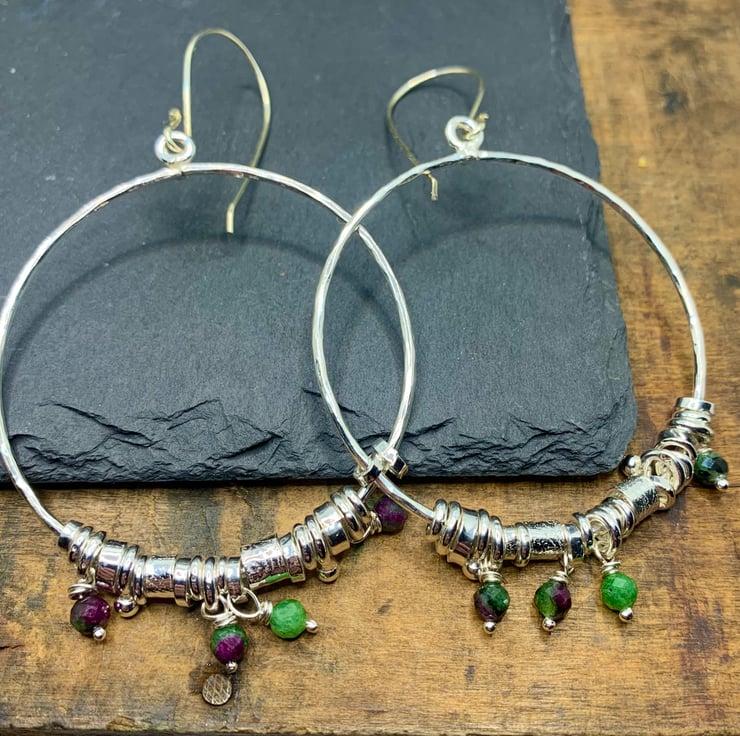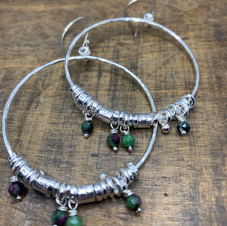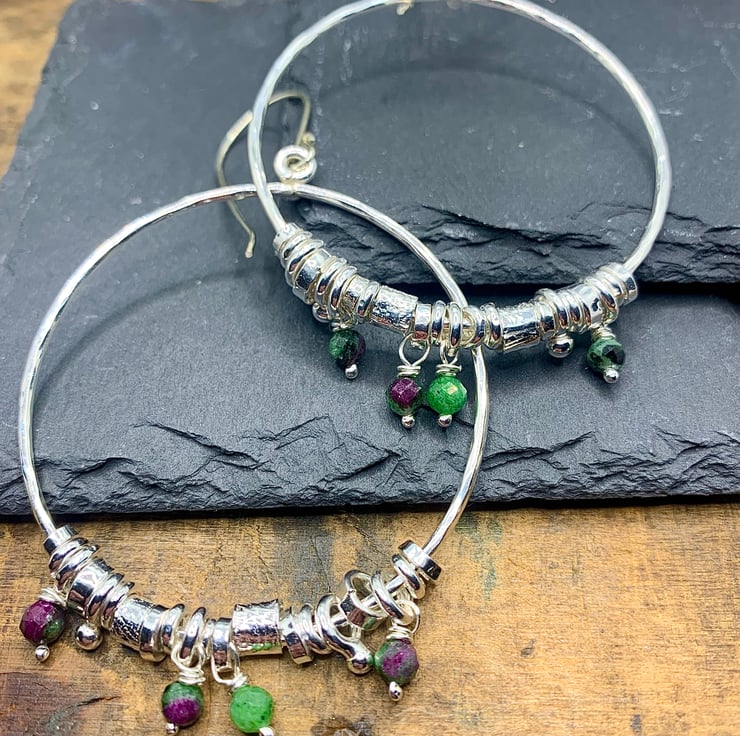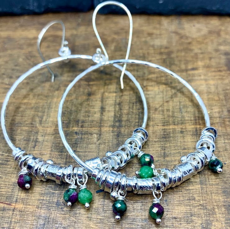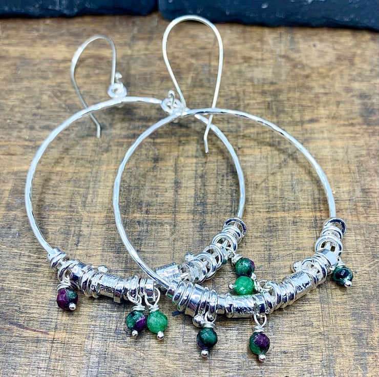 These earrings are handmade using various sizes and styles of silver washers, along with hand-faceted Ruby Zoisite Gem beads. All the components are threaded onto a silver hoop that measures approximately 50mm in diameter.