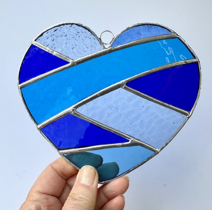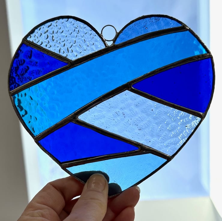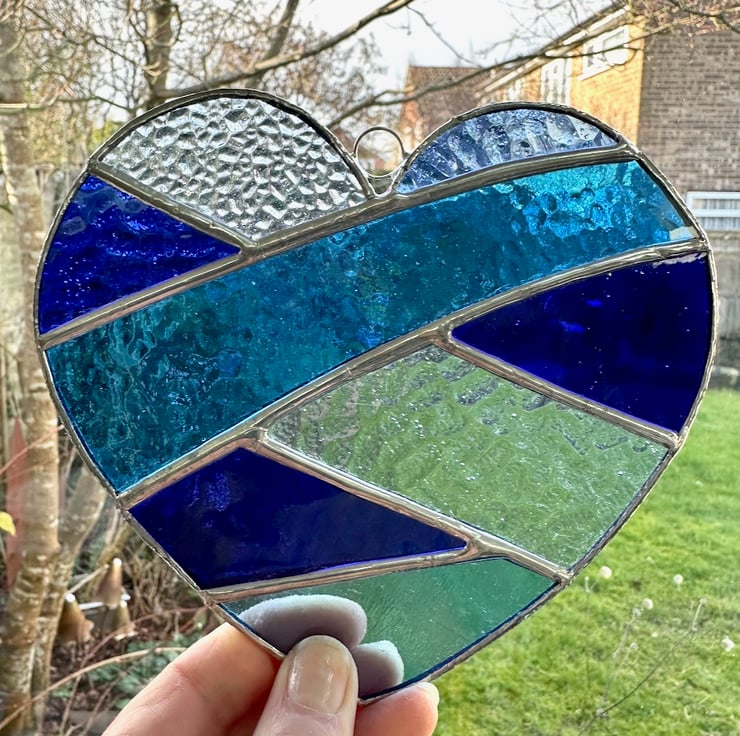 Heart suncatcher made in a patchwork design with beautiful blue and turquoise stained glass by Carole's Glass.