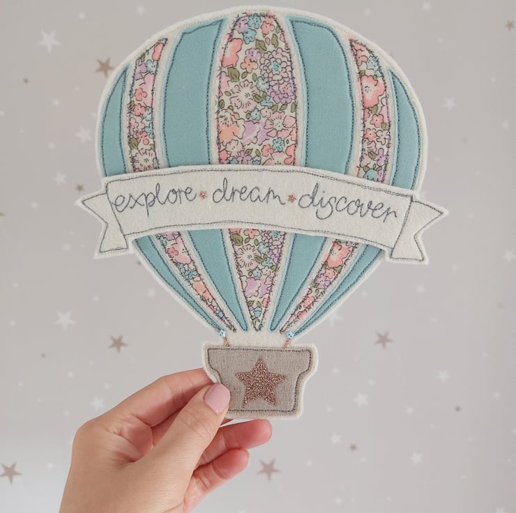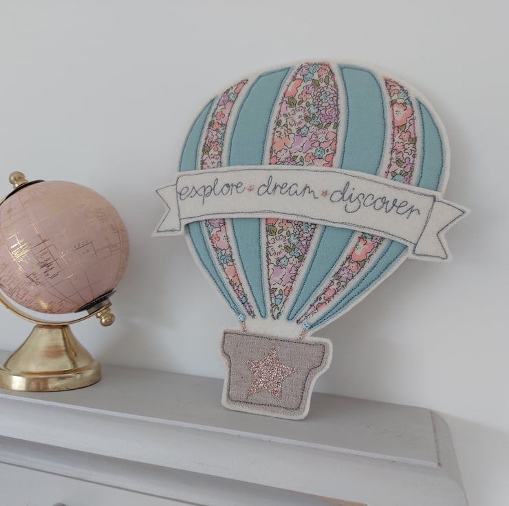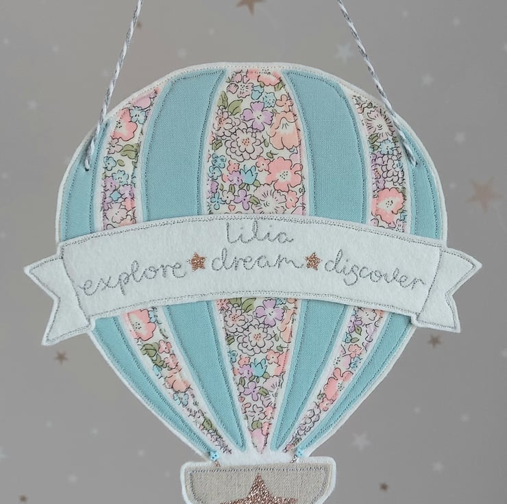Inspired by a love of travel and adventure, as with most of my nursery pieces, this hot air balloon was originally designed for my little girls room. Made with gorgeous Liberty Michelle tana lawn fabric and a hint of sparkle.