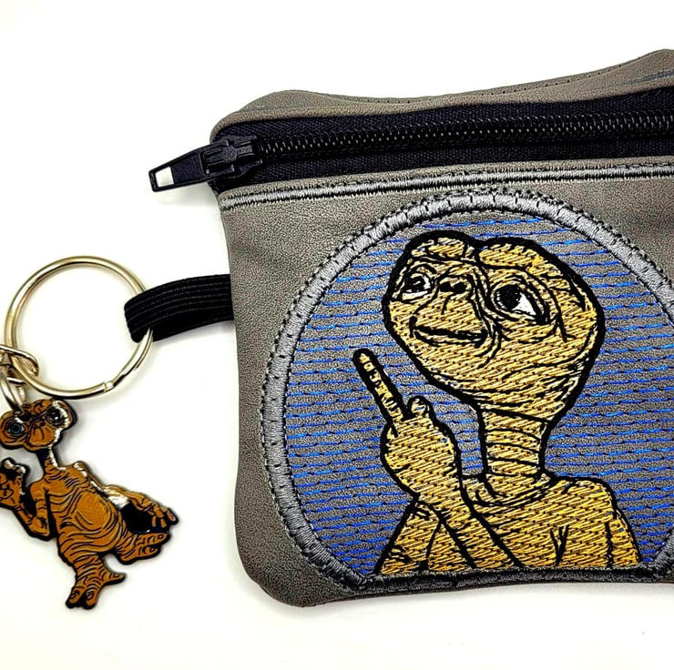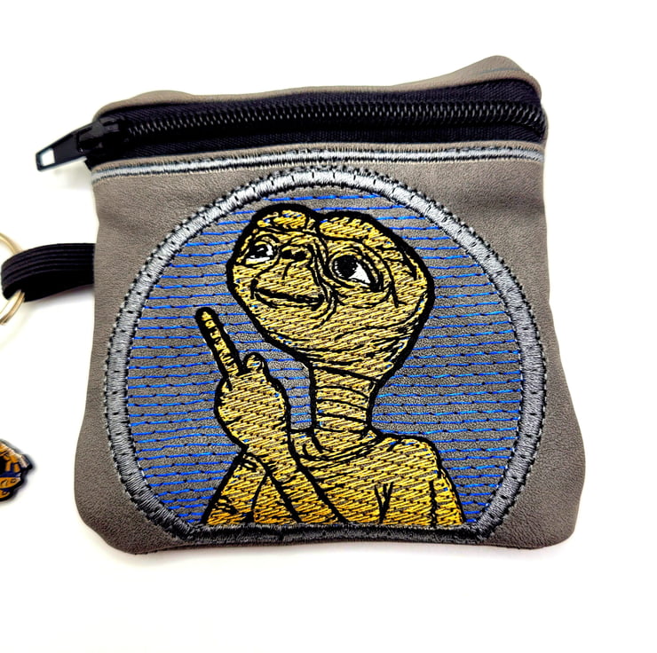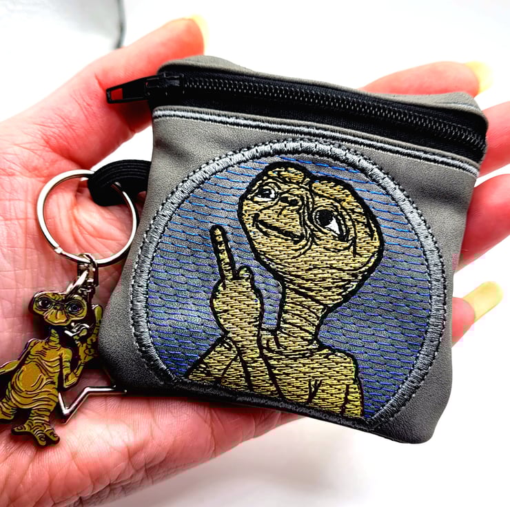 This fun ET coin purse is just the perfect size to pop all your loose change in. With Embroidered ET giving the middle finger this purse will be sure to make anyone smile.