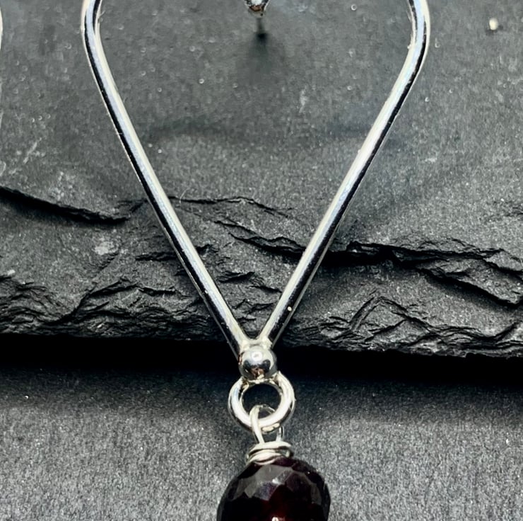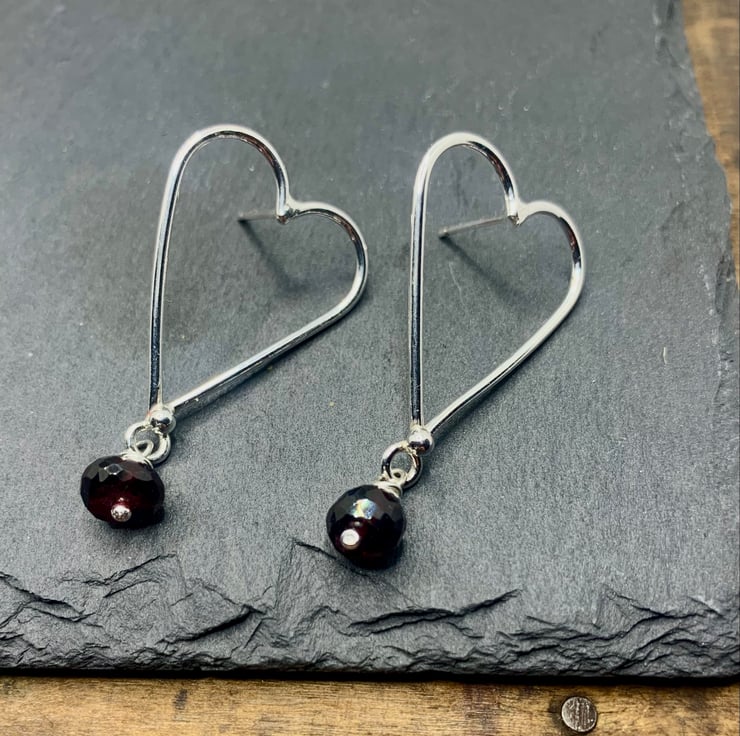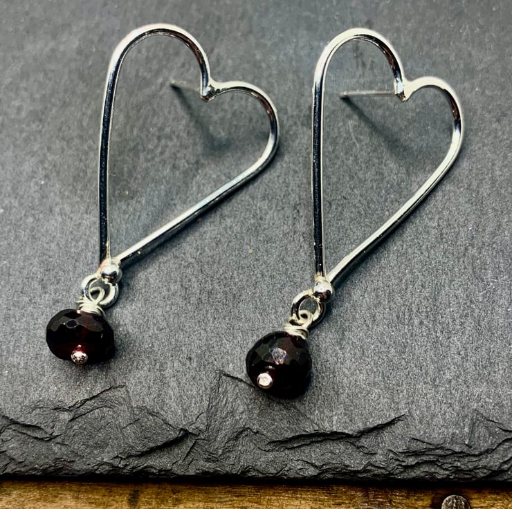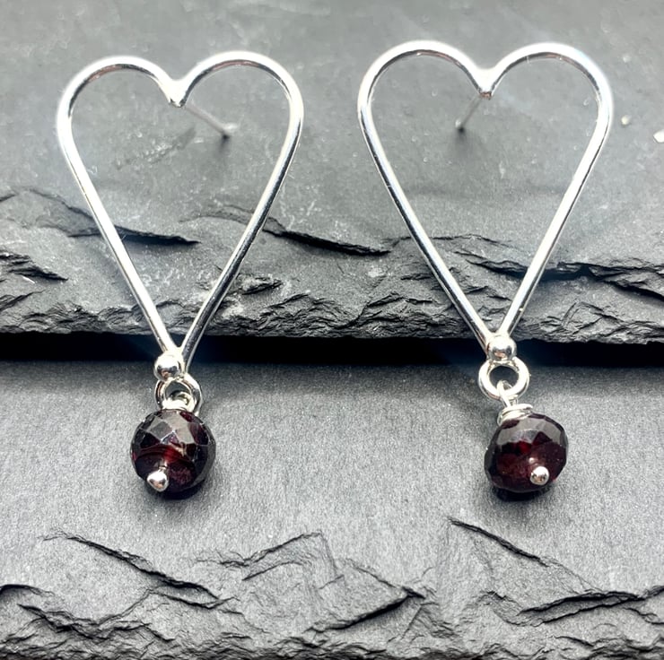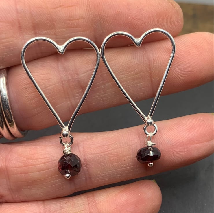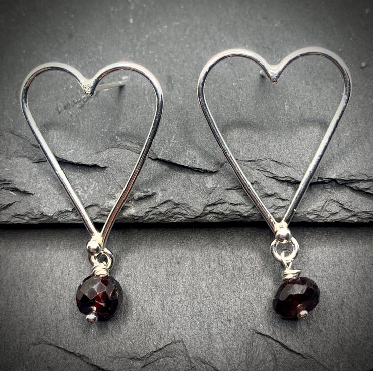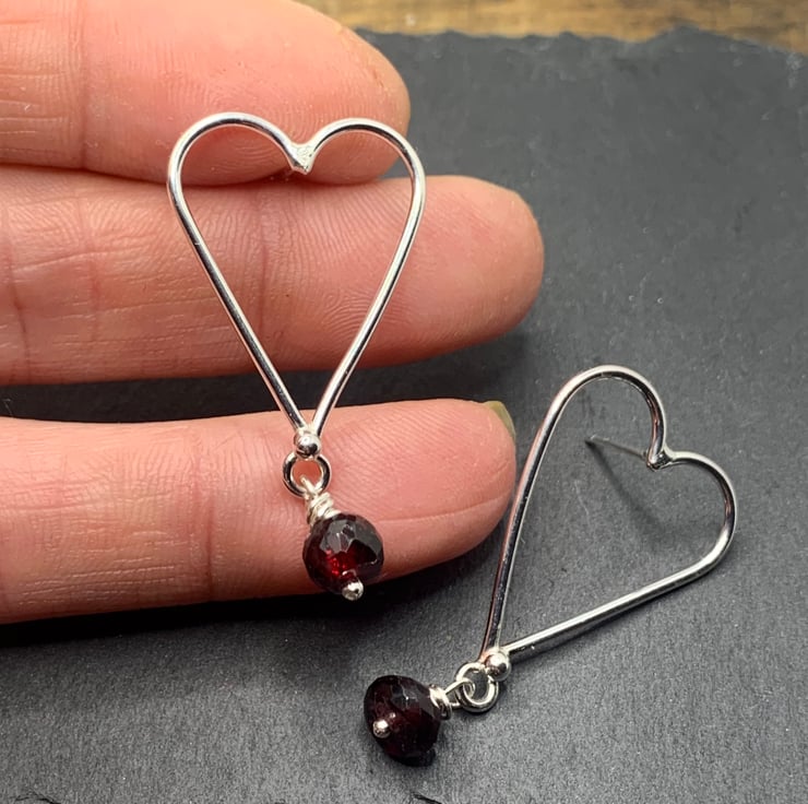 Handmade sterling silver open heart earrings with a hanging garnet gem