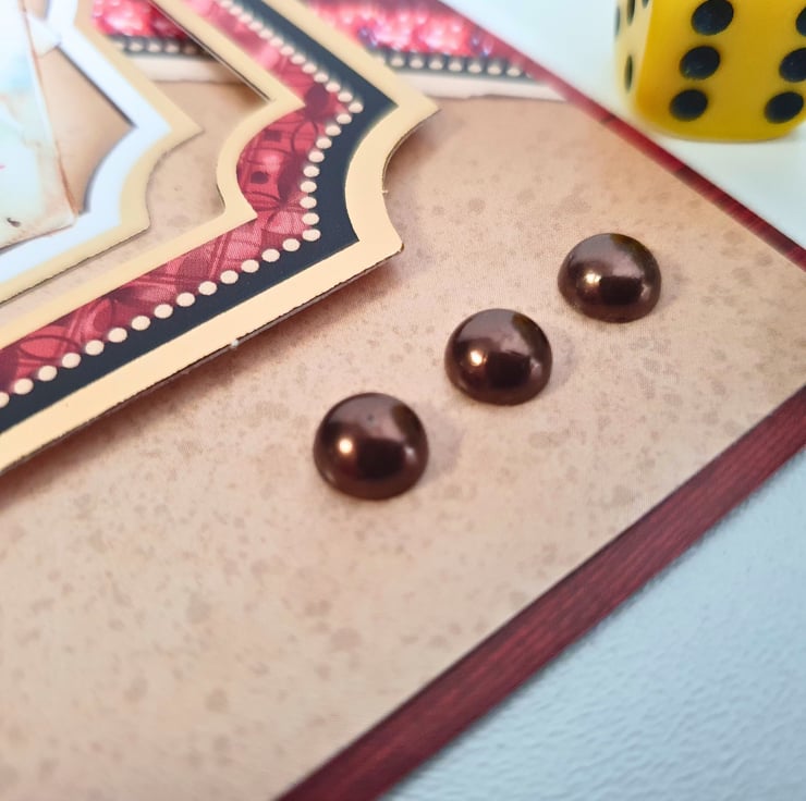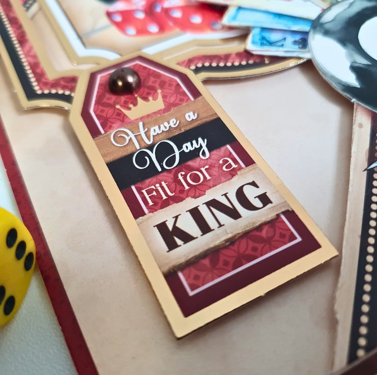 It consists of white card base layered with luxury paper and patterned cardstock in beige, with brick-red diagonal panels & gold foiled toppers. A handful of playing cards, a snooker ball, dice, darts and poker chips, all familiar items to casino lovers! The sentiment tag reads "Have A Day Fit For A King". The card is decorated with adhesive pearls in metallic brown colour. It is finished with a matching insert that has been stamped with the sentiment "Happy Birthday".