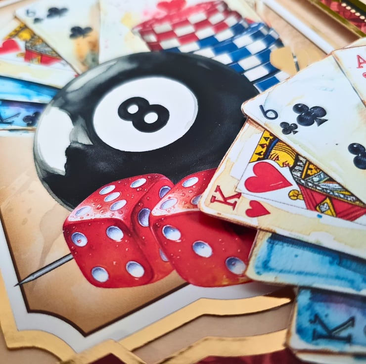 Handmade birthday card perfect for those who love casino games, darts, snooker, playing cards, dice and all sorts of lucky games!