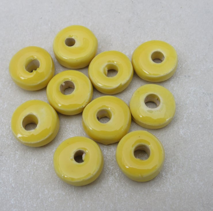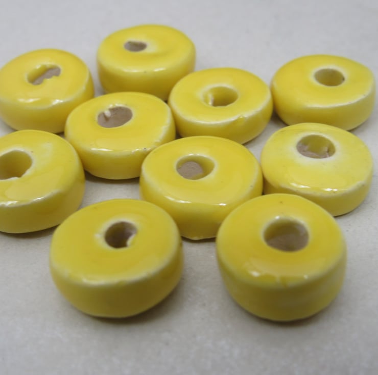 They are approx 1.3 cms (0.5") diameter, with a 3mm (0.1") hole but as they are handmade, they are not identical and not perfectly round.