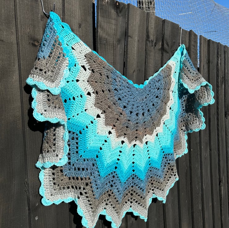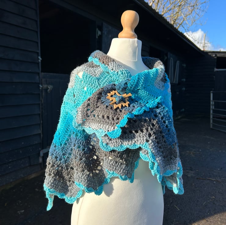 My design and my hand made crochet project in soft 20% wool mixed cake yarn. The yarn moves slowly from navy blue to turquoise to grey with a hint of brown