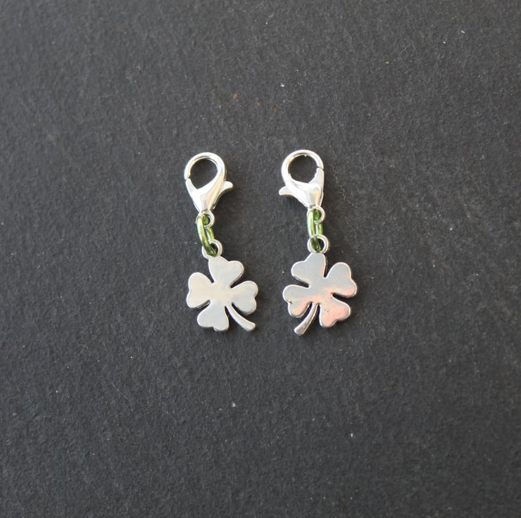 A shiny silver tone shamrock stitch marker or progress keeper. Each double-sided shamrock charm is attached to the silver tone lobster claw clasp with a light green coloured ring.