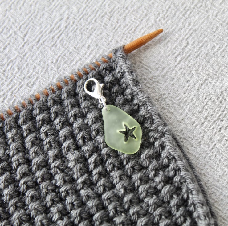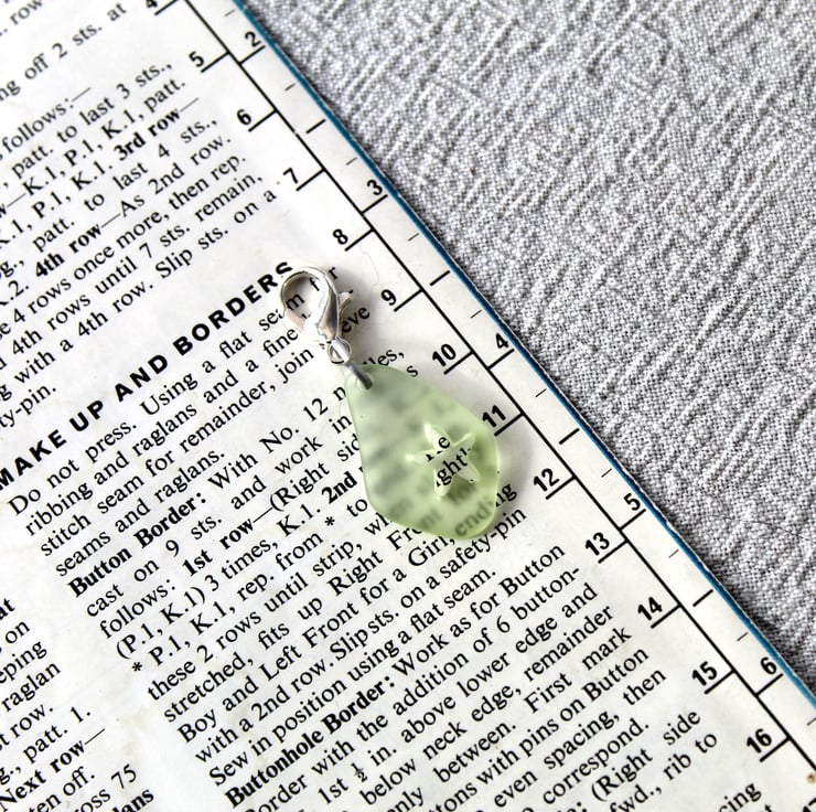 A resin 'sea glass' inspired stitch marker or progress keeper. Suitable for knitting and crochet. Lightweight. A frosted hardened aluminium ring attaches the charm to the clasp. Frosted to match the matt resin charm. It is this attention to detail that makes Rebecca's Room accessories a step up above the rest!