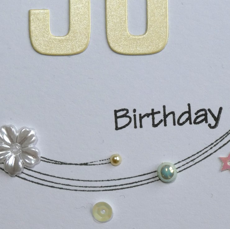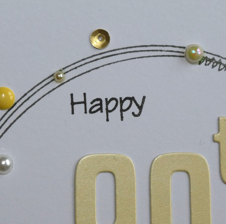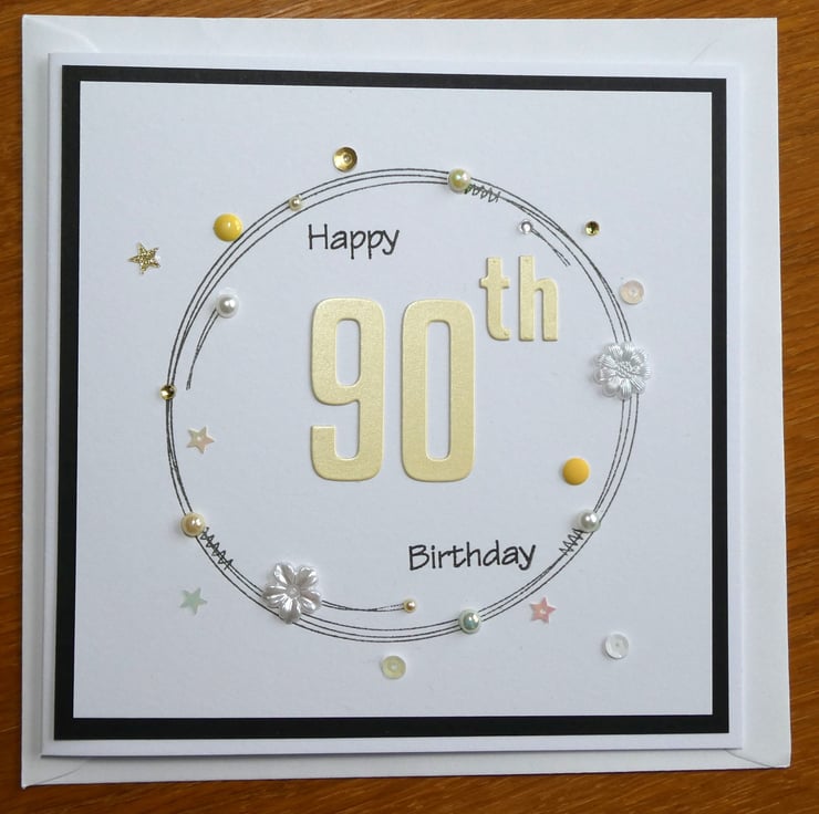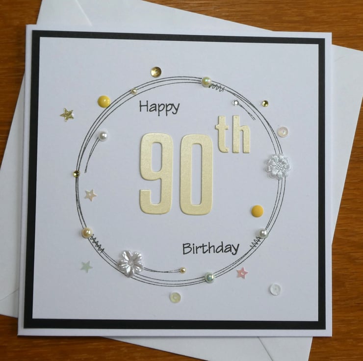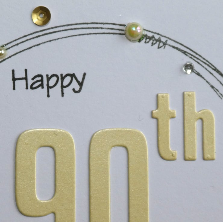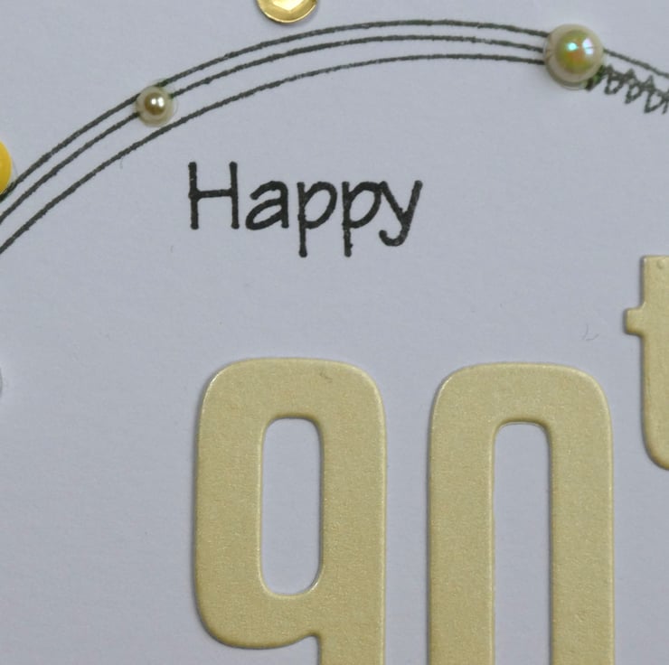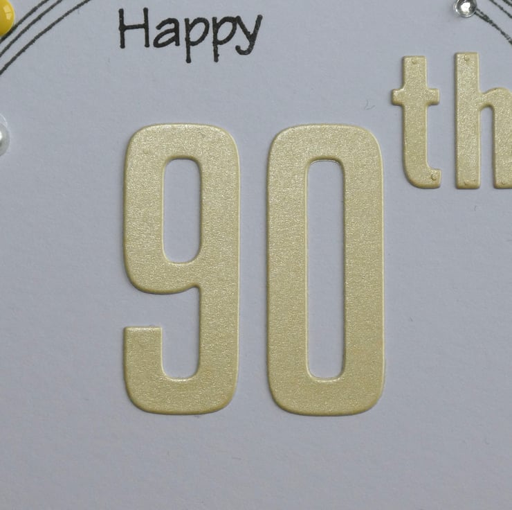 This special 90th birthday card has been hand stamped and decorated in shades of yellow, white and gold.