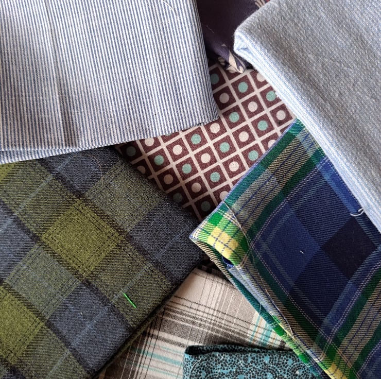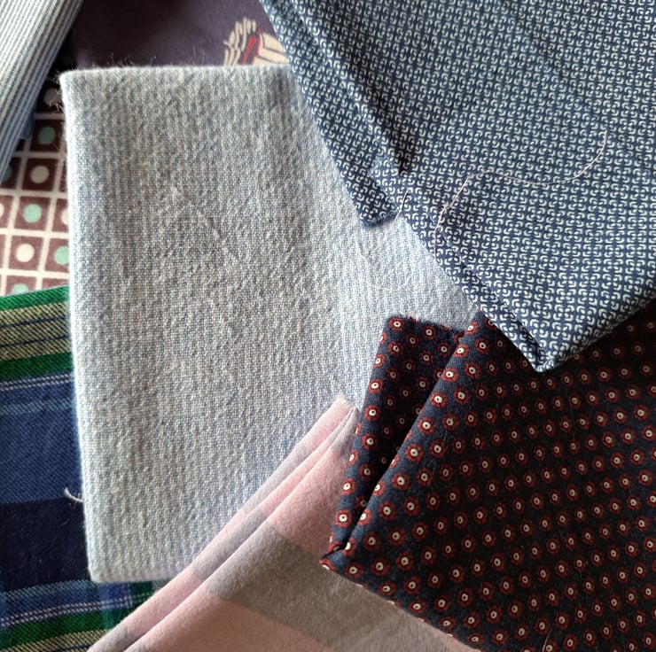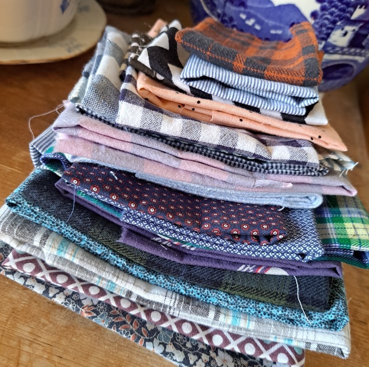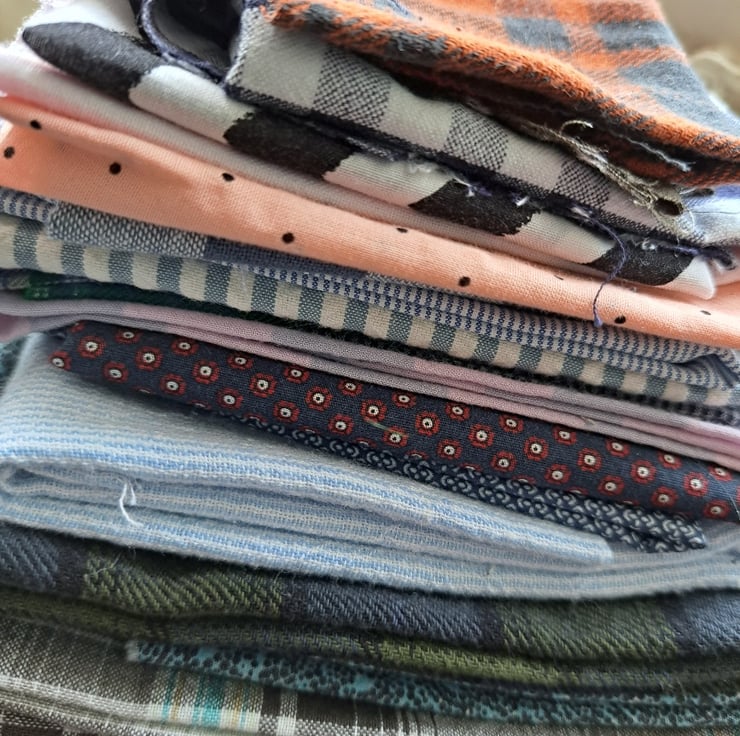 This towering pile of cotton fabrics was once a towering pile of shirts. Checked, patterned, striped, you name it. The 20 pieces in this bundle range in sizes and colours but are jostling for a new life in your textile projects.