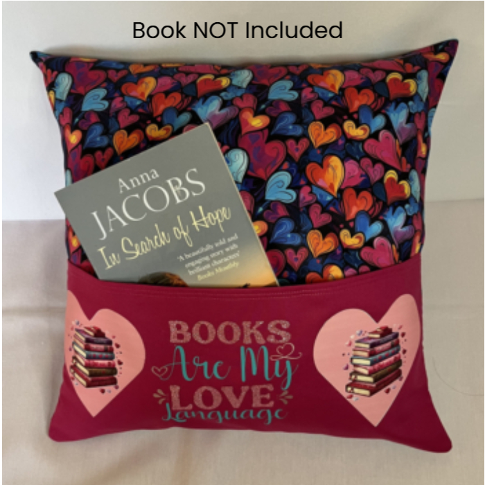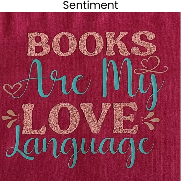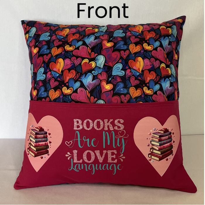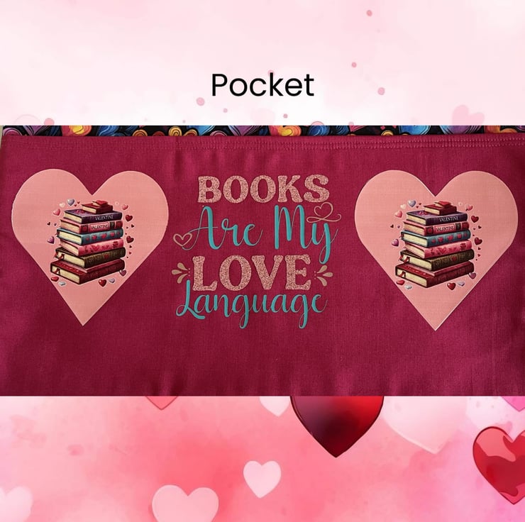 BOOKS ARE MY LOVE LANGUAGE is the sentiment on the pocket along with images of books in a heart.