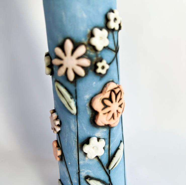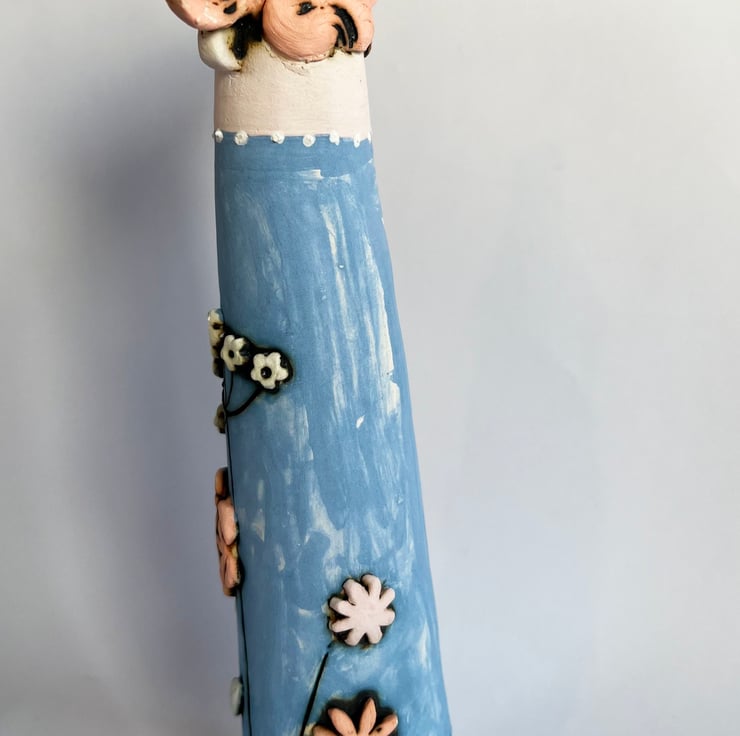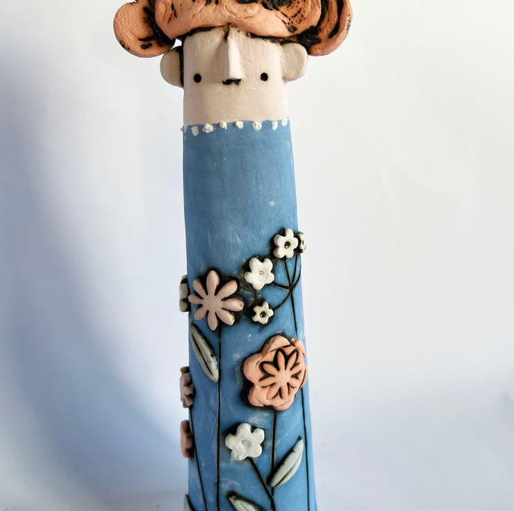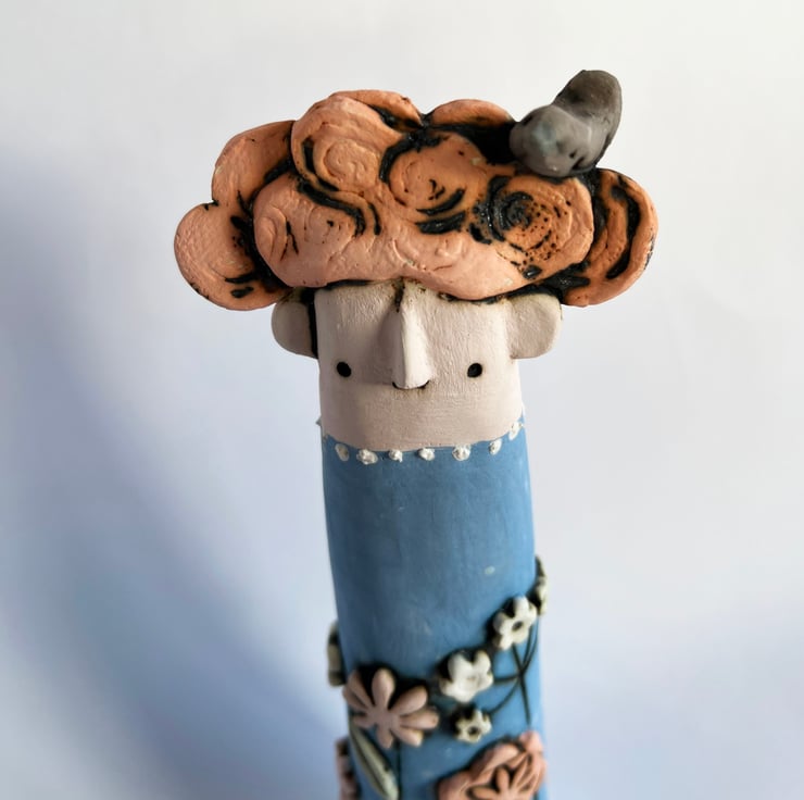This quirky lady with floral embellishments has rather wild hair which is home to her bird friend. Hand built from stoneware clay and decorated with slips and oxide, she stands around 20cm tall.