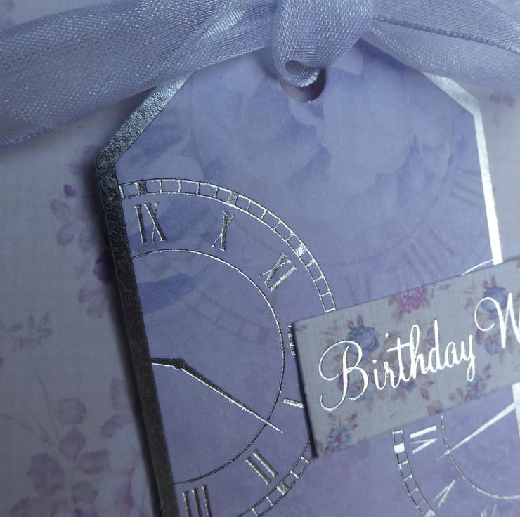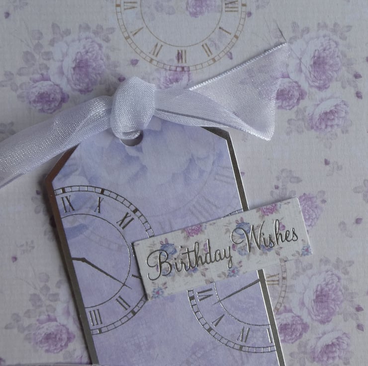 The pocket has a floral butterfly embelishment and a removable message with the greeting Birthday Wishes on a tag shaped card, which has been tied with a white organza ribbon.