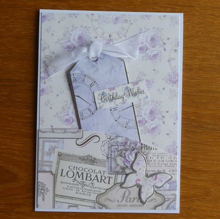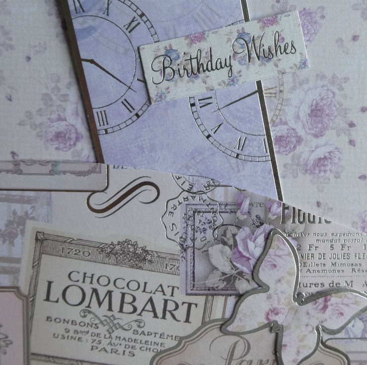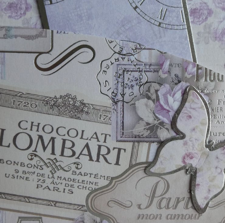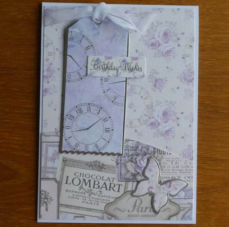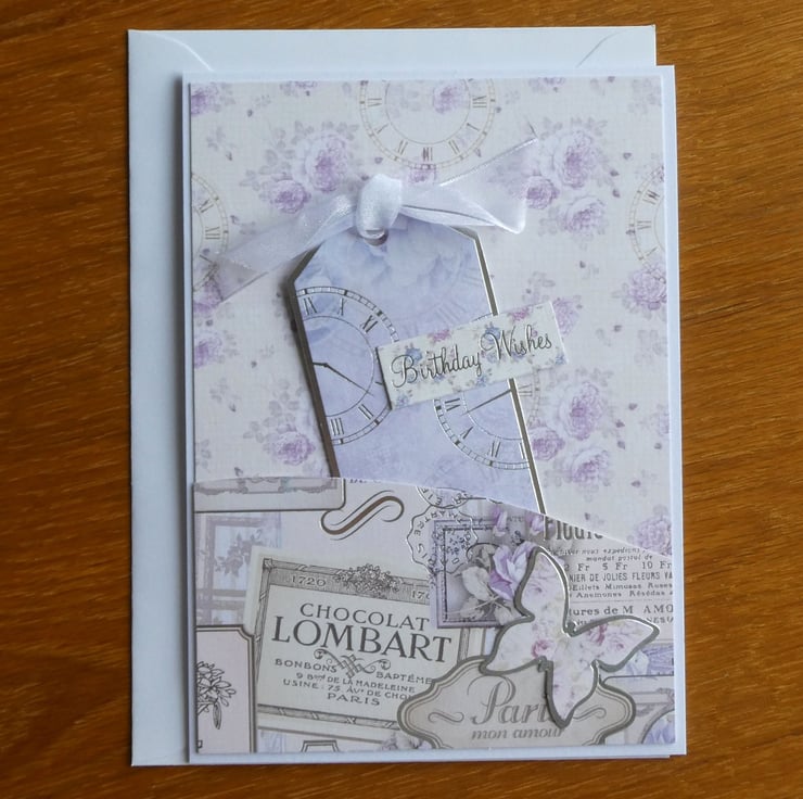 The cream background card has a printed floral and clock design in shades of grey and lilac. A curved pocket with a decoupage style print in a Parisienne design has been added across the bottom.
