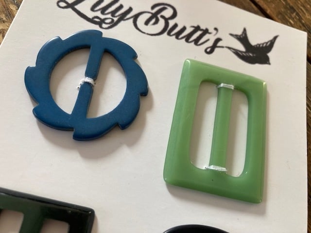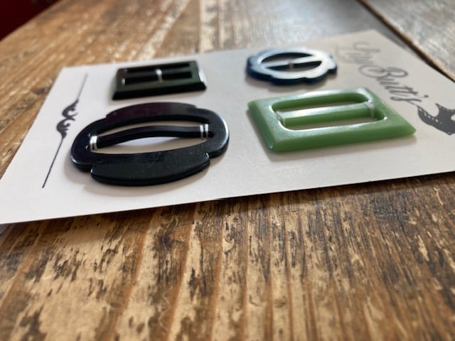 4 Vintage Small Buckles & Slides- Green Black and Blue, 4 pretty buckles, the lime green is marbled and the dark green is pearly! Use them in dressmaking, bag making or use as a scarf slide.