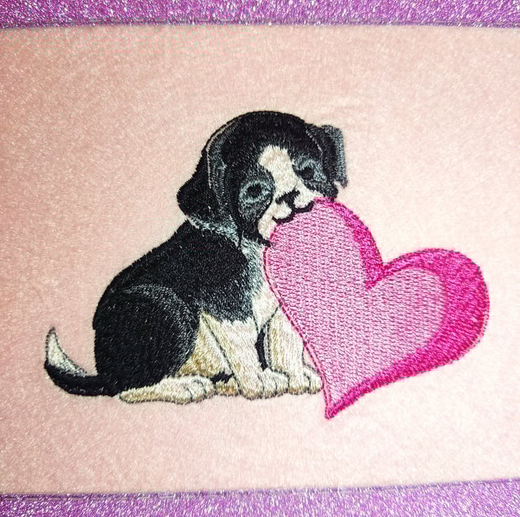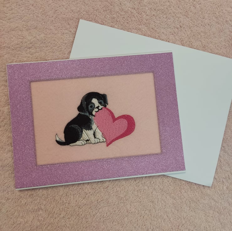 Stunning Puppy, holding a precious heart - Valentine's Day card