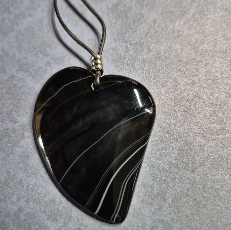 Black onyx agate heart pendant on black leather with stainless steel connector and slider. Stunning piece that would suit any occasion with white veins running through makes this a unique and eye catching piece.