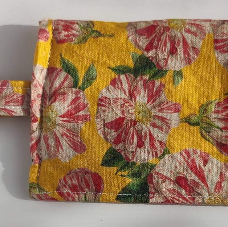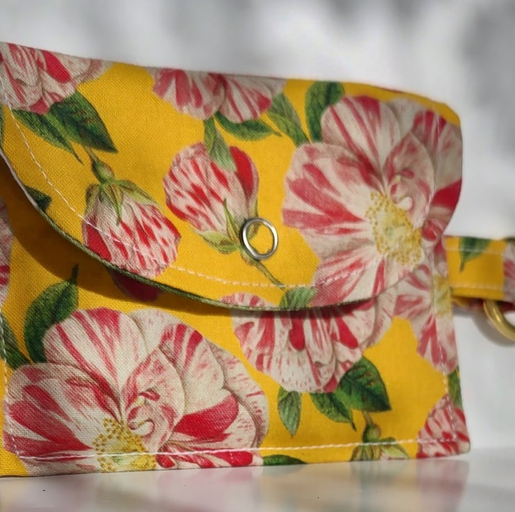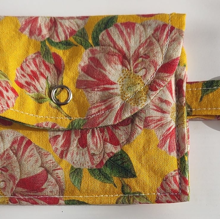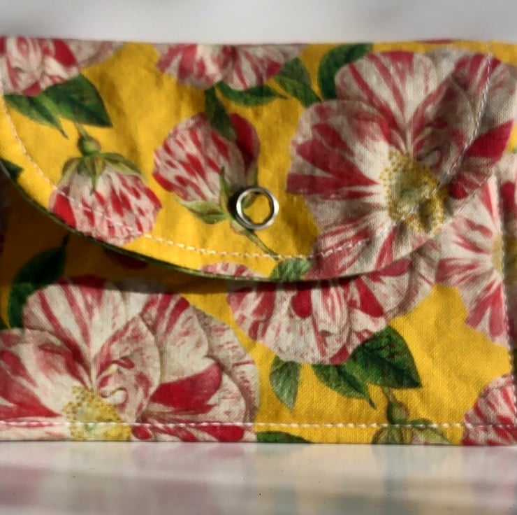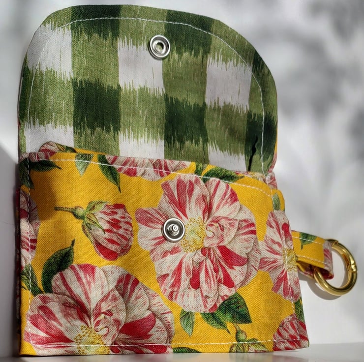 This card holder purse is handmade from RHS Edwardian flower design cotton material and is fully lined. It has three sections inside, which are suitable for multiple cards, money, or small items.