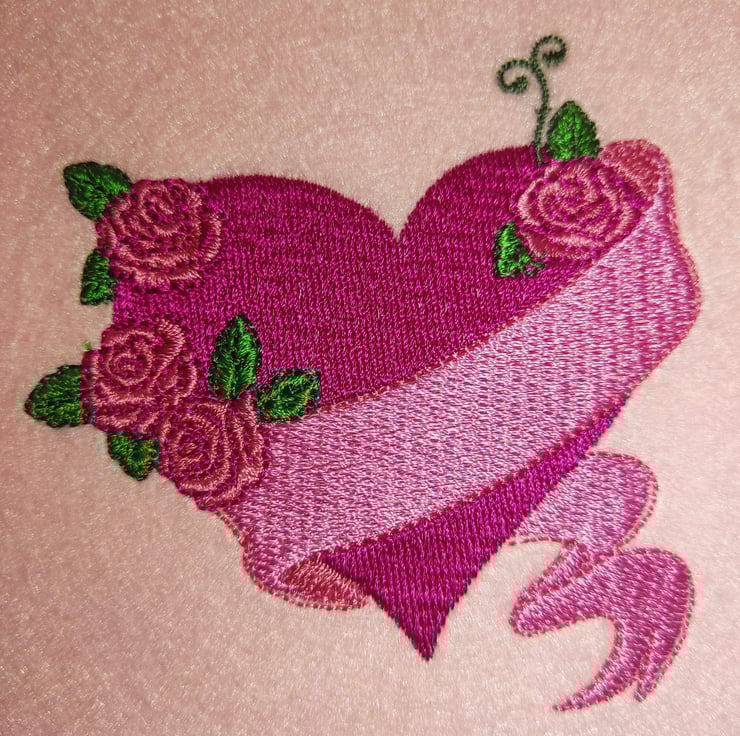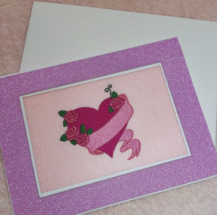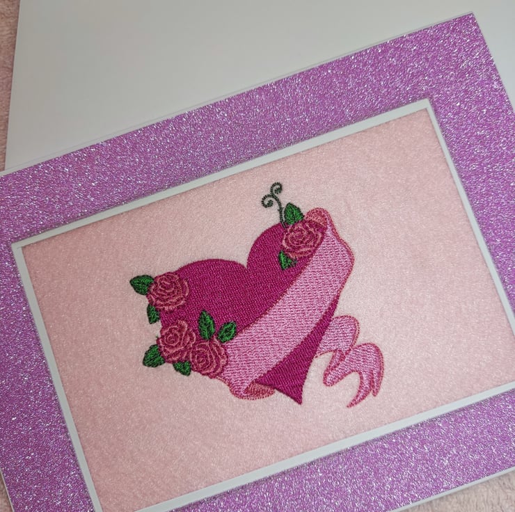 A beautiful heart, wrapped in stunning flowers with a pale pink banner. Hand finished and mounted in a gentle purple glitter card.