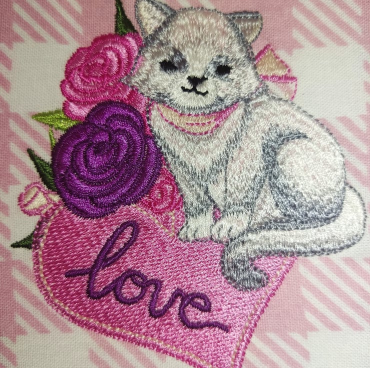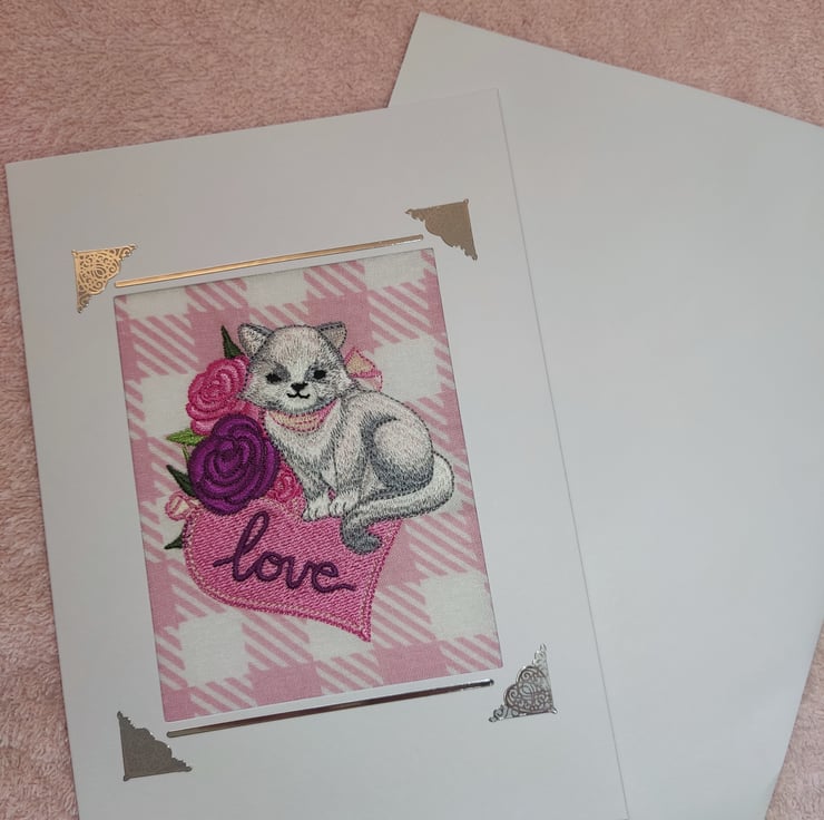 A precious kitten, sitting on a beautiful love heart, surrounded by flowers. Silk embroidered design hand finished with Silver edging.