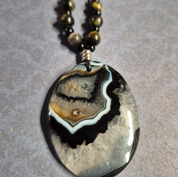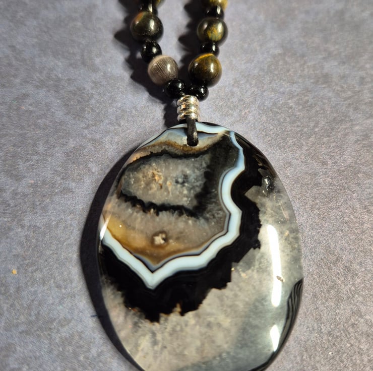 Black vein agate oval pendant on black leather making a unique and eye catching one of a kind pendant with match beads which complement the stone.