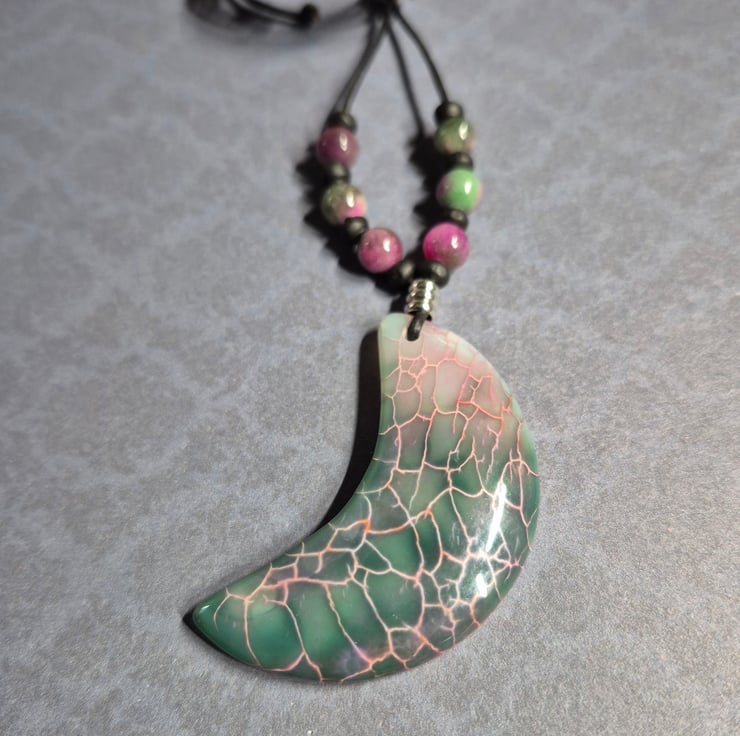 Half moon pendant green fading with veins of light pink throughout on leather cord with stainless steel connectors and sliders complimented with 6mm Persian jade beads and 4mm matt black howlite spacers.
