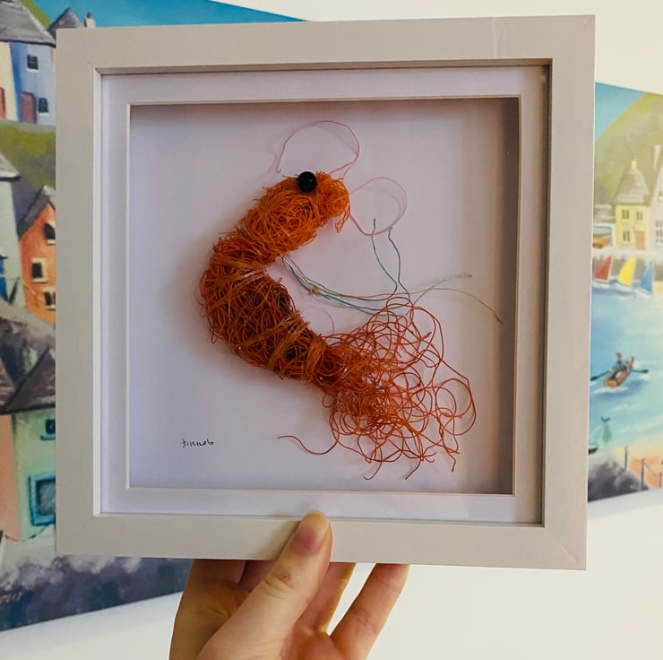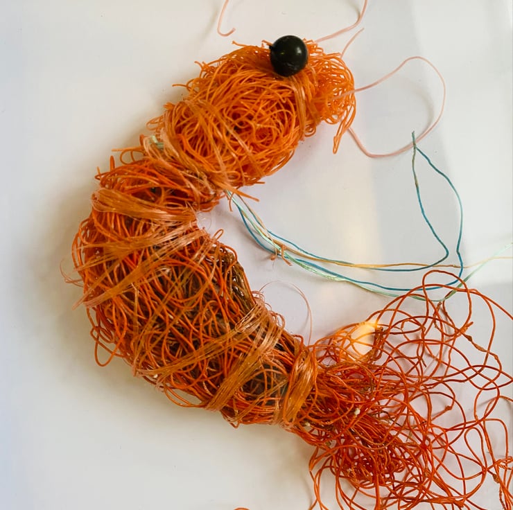 Our larger prawns are created using netting blown in from the sea and fishing ropes and lines washed up along the shore. The eye is a black plastic bead.