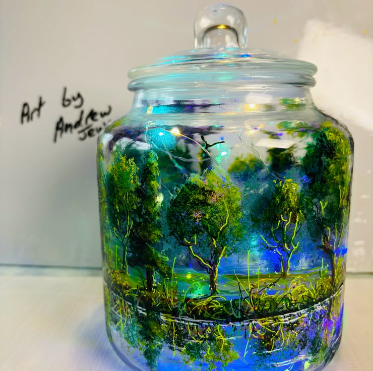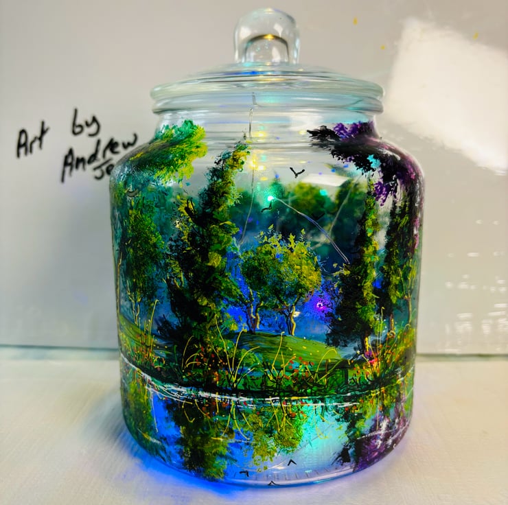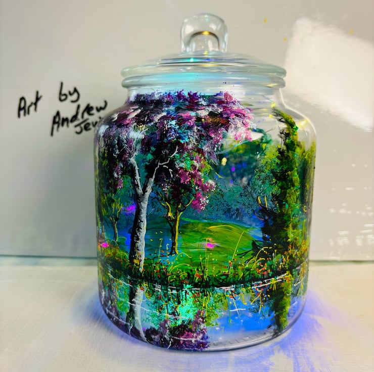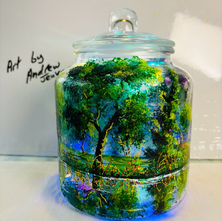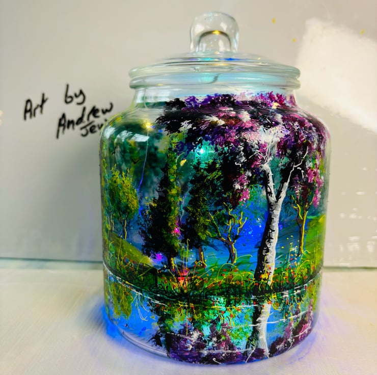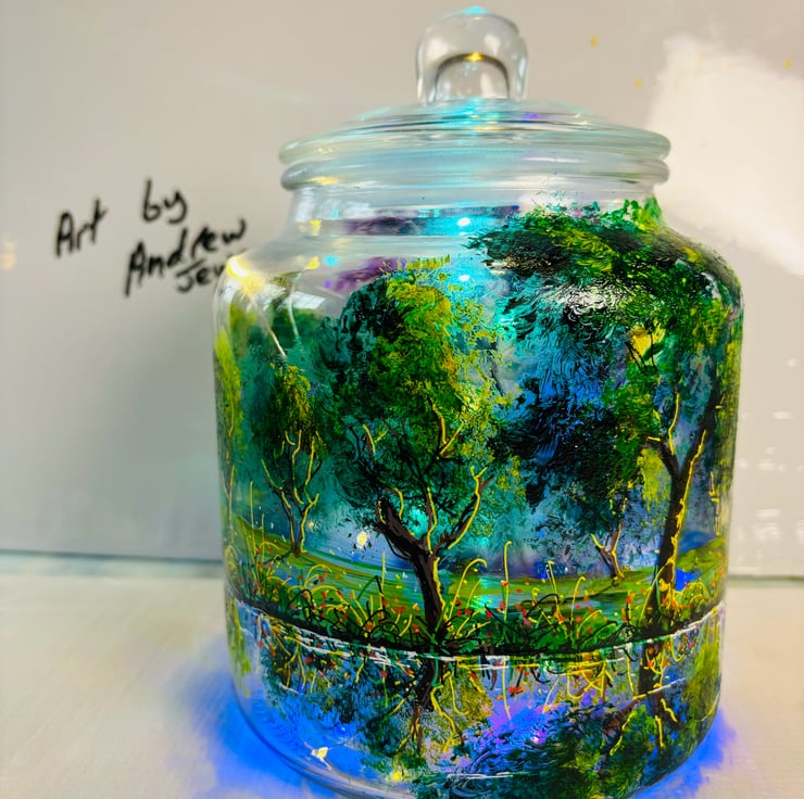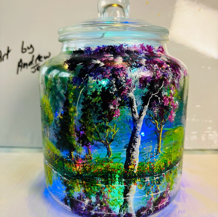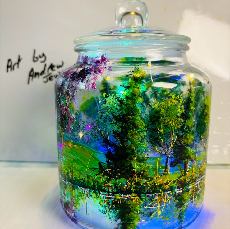 A hand painted and fired glass jar with glass sealable glass lid by Andrew Jenkins