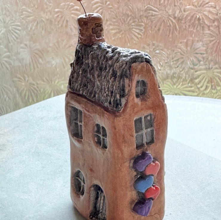 This minature house is made with details of many detailed windows and doors, a tiny yellow bird house sits on the front wall, to the side of the building is decorated with a string of different coloured hearts. Out of the tiny chimney pot is a puff of smoke in a heart shape that floats about the house. After being carefully hand painted the house has been finished with a high gloss glaze.