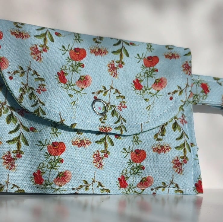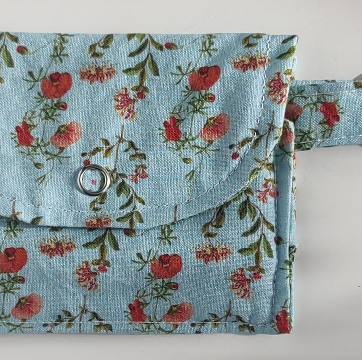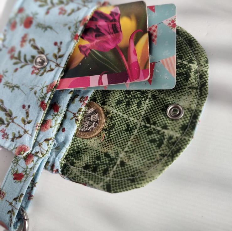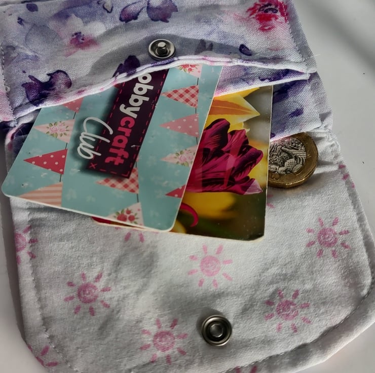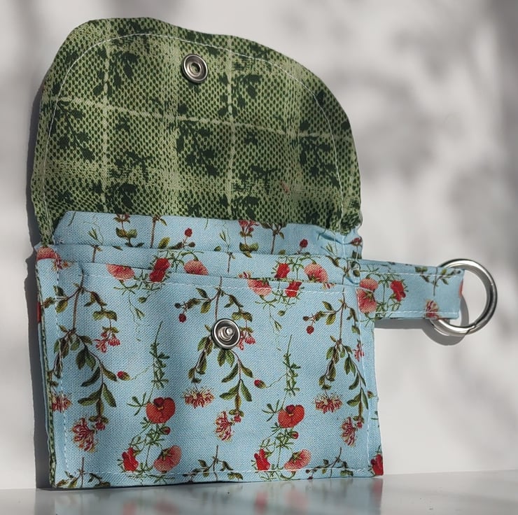 This card holder purse is handmade from RHS Edwardian flower design cotton material and is fully lined. It has three sections inside, which are suitable for multiple cards, money, or small items.