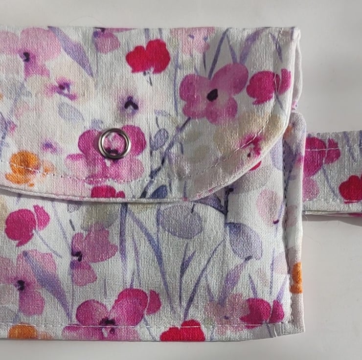 Card Holder Purse - purple and pink flower design, fastener, and attachment clip