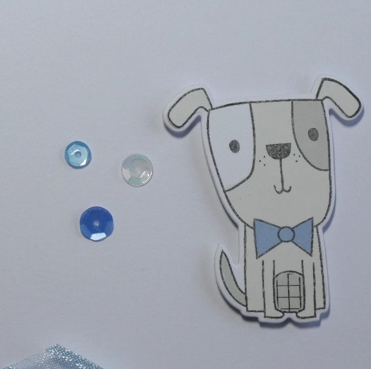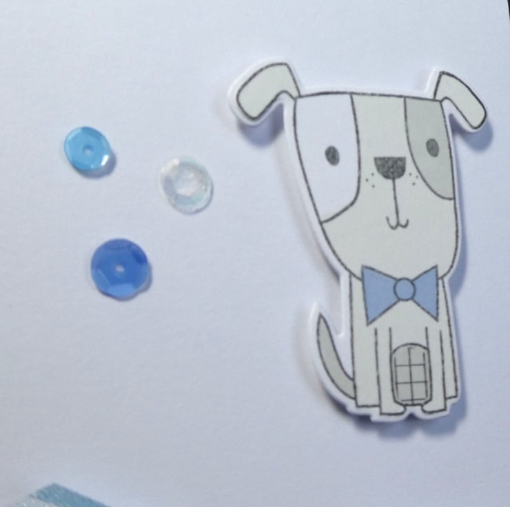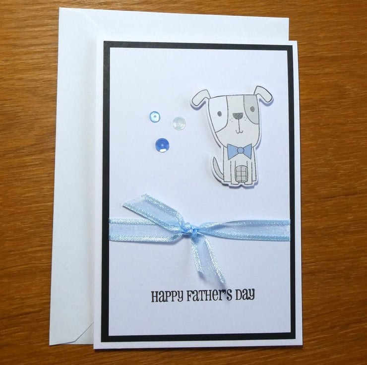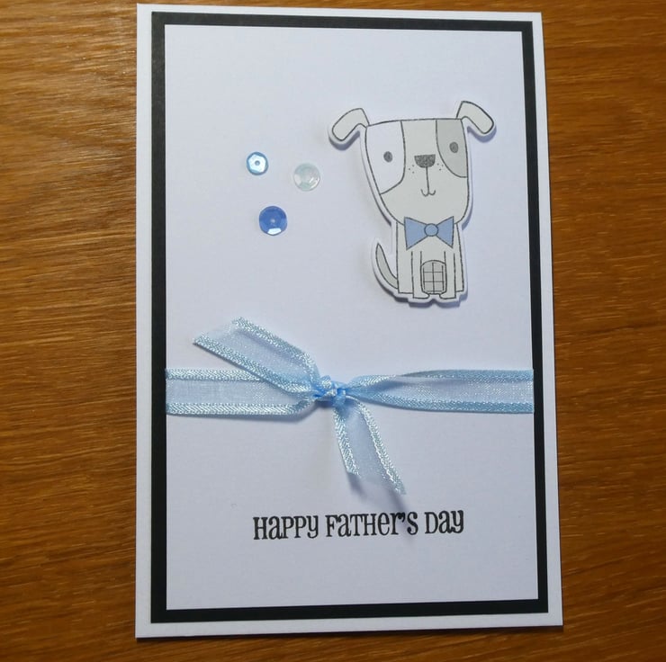 The dog has been hand stamped and inked in shades of blue and grey and then die cut and fixed with foam pads to raise it slightly from the background. Three sequins in a mixture of holographic and shades of blue have been added and the greeting Happy Father's Day has been stamped in black archival ink.