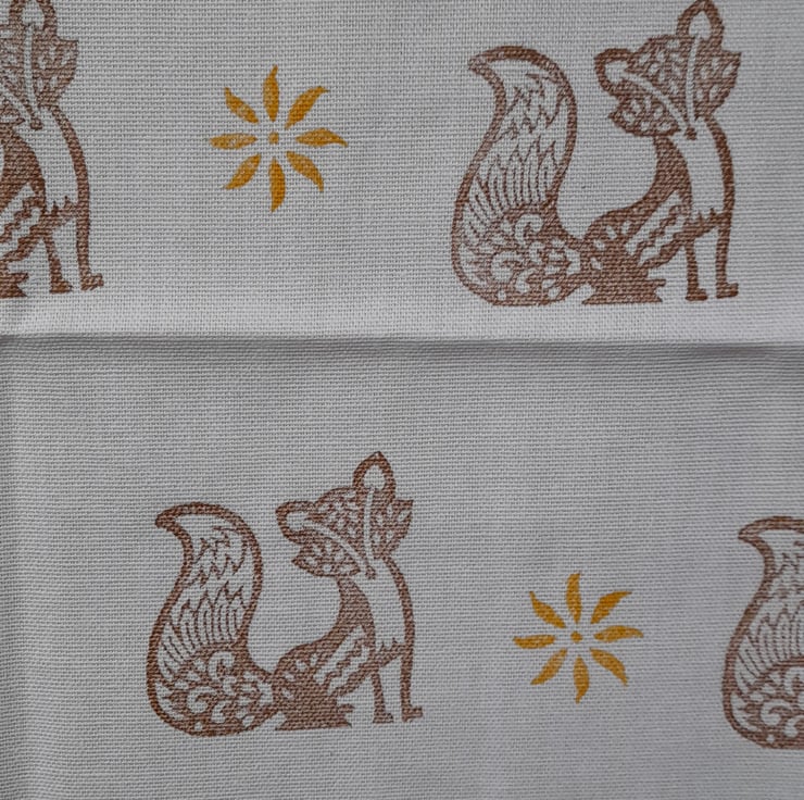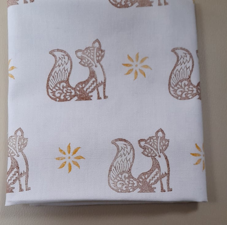 Handmade block printed tea towel with fox design. 100 % cotton. Washable at 40 degrees. 65cm long x 49cm wide. Hanging loop.