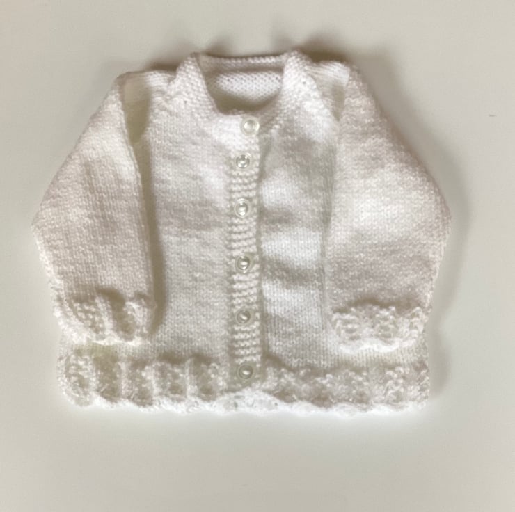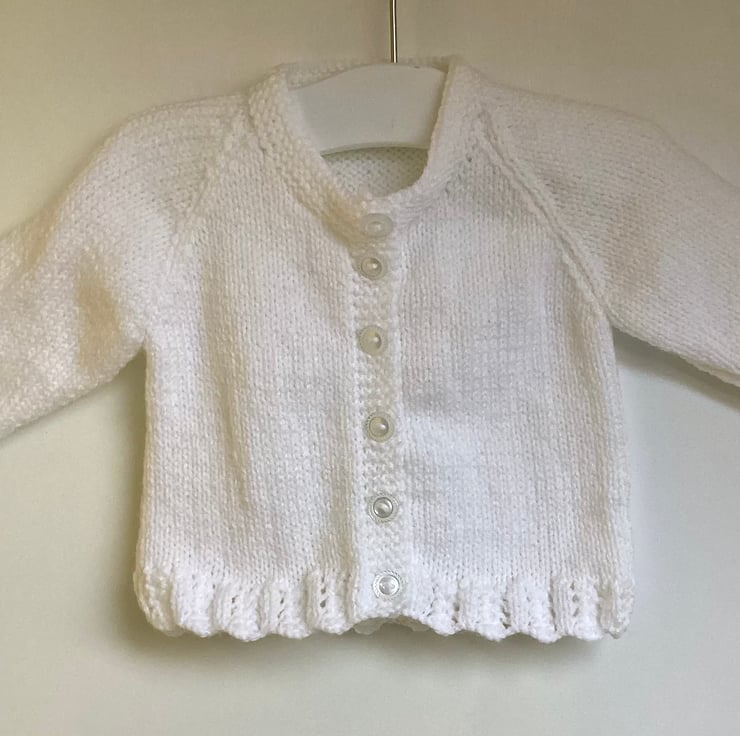 Sweet little white baby cardigan hand knit by me in my Suffolk home. Versatile must have in any little girl’s wardrobe, pretty with the lace edging, easy to wear and will go with any outfit. Fastens with five white baby buttons. Knitted to fit a little one from three to six months approximately. The actual garment measurements are as follows,