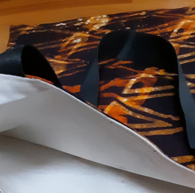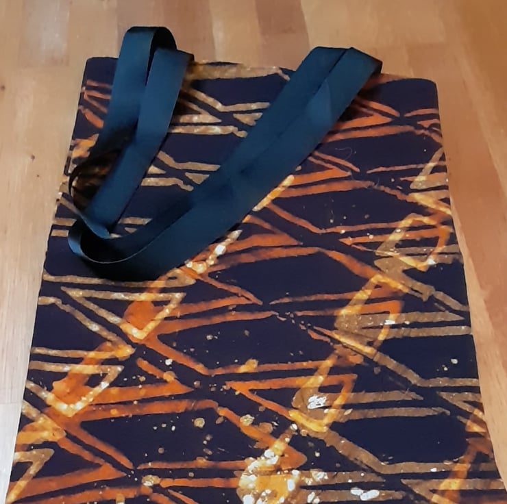 Tote bag handmade from genuine African batik. Black and orange print. Lined with cream calico. Black webbing handles. 36cm long, 28.5cm wide. From top of handles to top of bag is 24cm