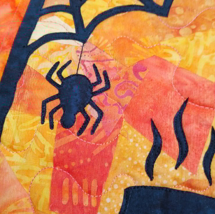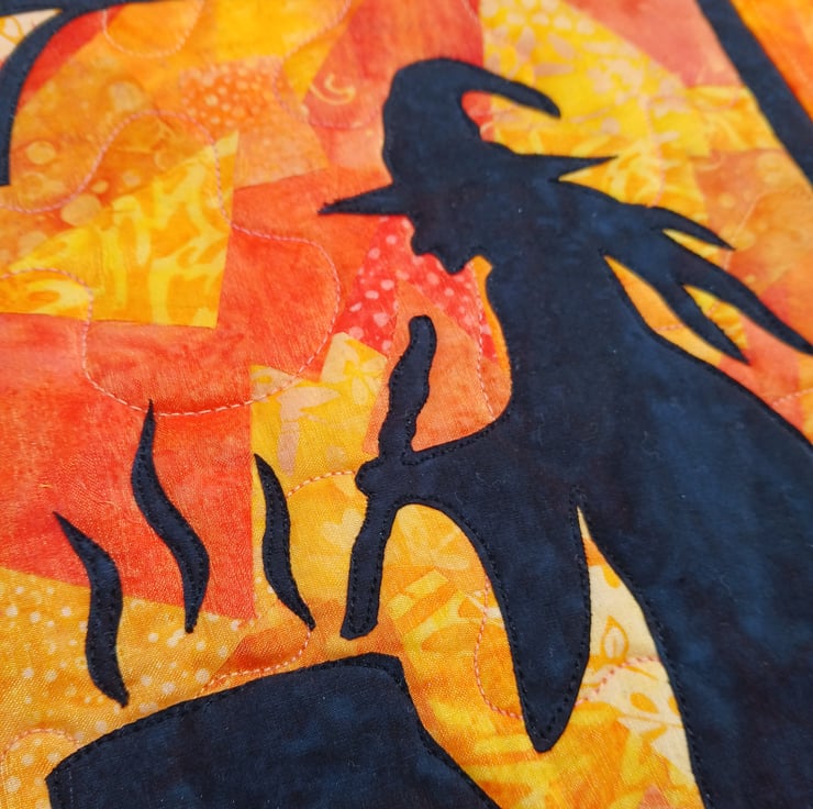 This design uses raw edge applique and fabric collage. I would recommend this to crafters familiar with free motion embroidery.